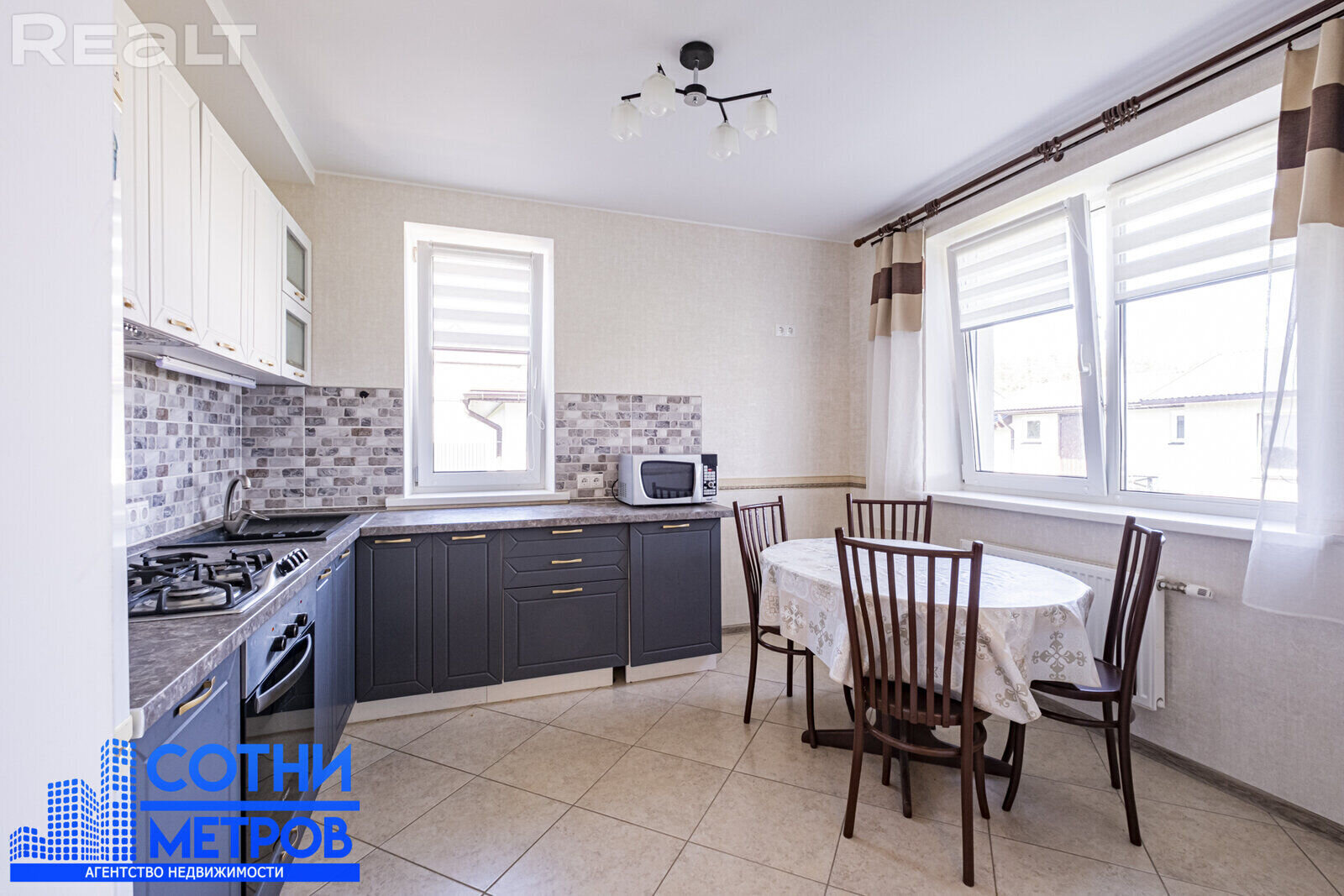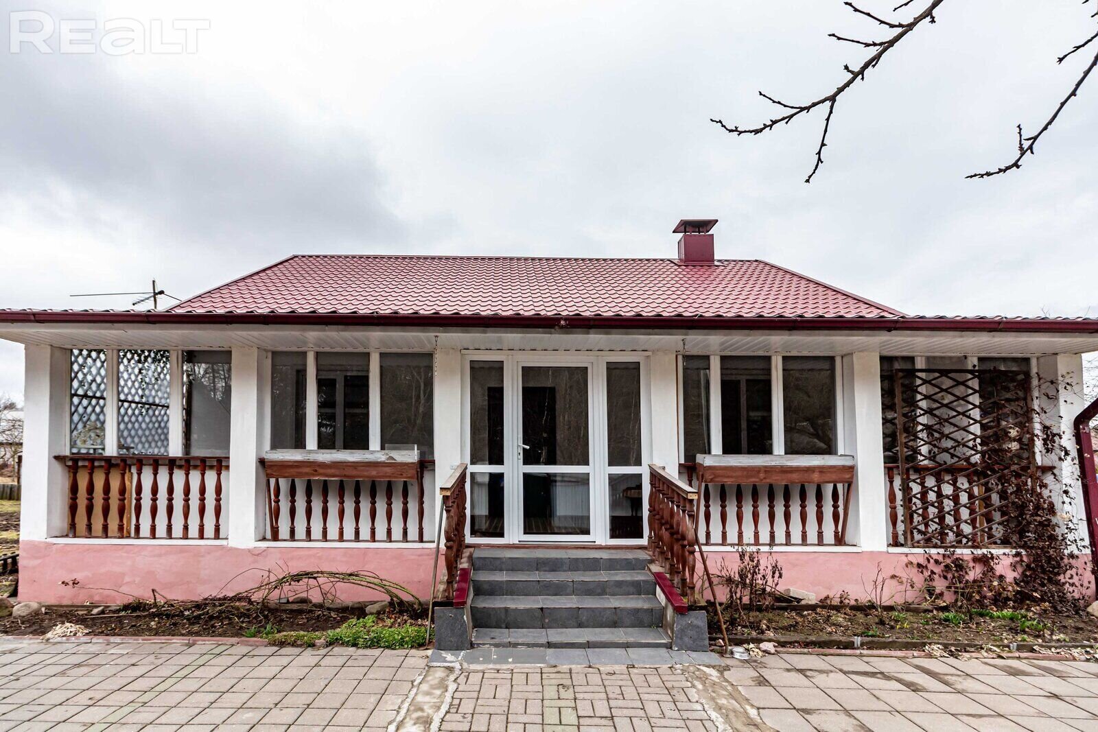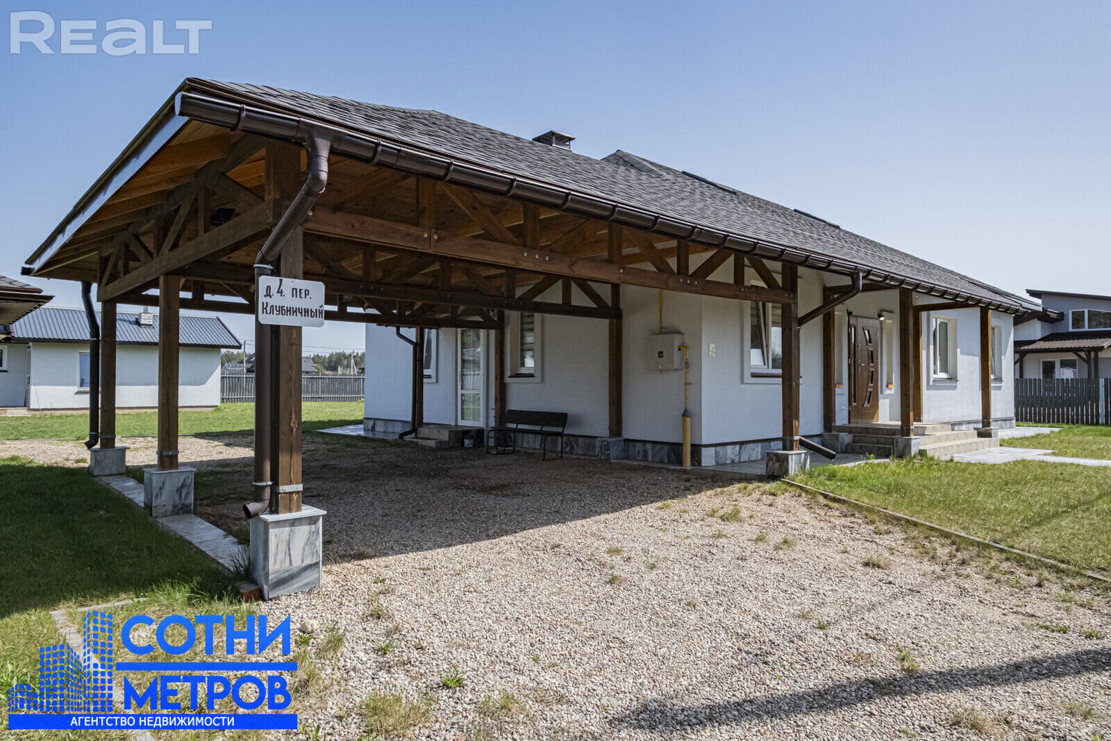 Он из блоков, утеплен, фасад отделан. На крыше — металлочерепица. Внутри 4 спальни, большая гостиная-кухня, два санузла, топочная, кладовка, гардеробная и терраса. Стоимость — 180 000 долларов.
