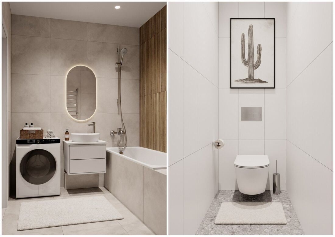 С дизайном ванной комнатой тоже предстоит определиться — на выбор предлагаются три коллекции: «Серый Basic», «Дерево Basic» и «Тераццо Basic». Предусмотрено и все остальное: ванна, инсталляция с унитазом, вместительная тумба с умывальником, полотенцесушитель, а также овальное зеркало с подсветкой.