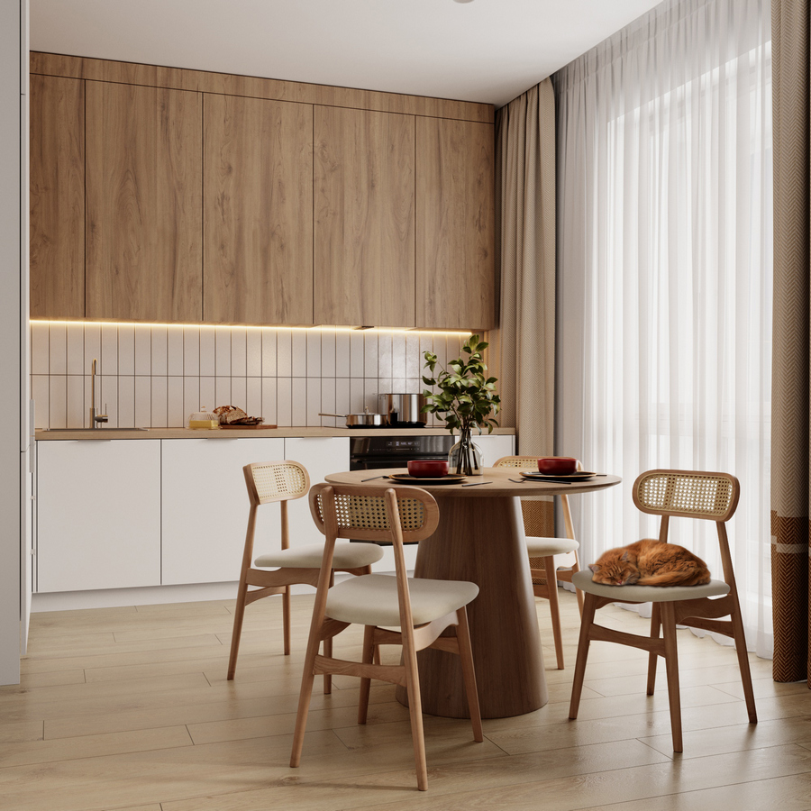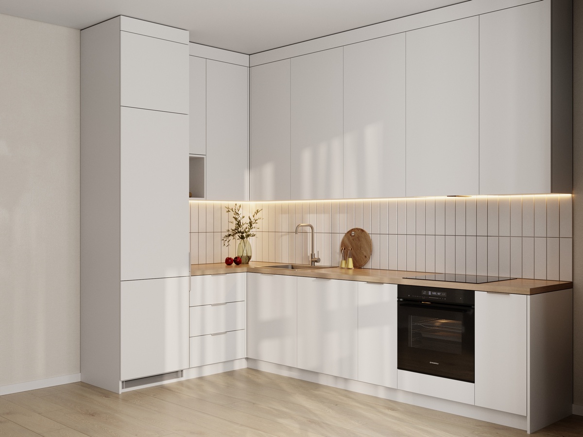 Вместе с отделкой можно заказать и кухню. Она будет укомплектована мебелью из ЛДСП и бытовой техникой. На выбор два варианта верхних фасадов — белого цвета или с текстурой дерева. В комплект кухни входят столешница, скиналь, мойка и смеситель. В полный пакет бытовой техники включены встроенный холодильник, встроенная вытяжка, варочная панель, духовой шкаф и посудомоечная машина. Вся техника — от Maunfeld или производителя такого же уровня.