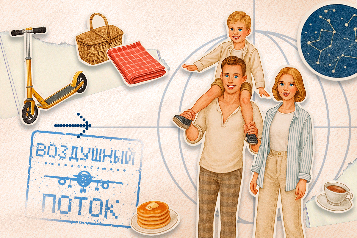 После работы они гуляют по лесной тропе. Сын собирает «магические» камни и кленовые листья, складывает их в свою «научную» коробку и с увлечением рассказывает, у кого какие суперспособности. Любимая точка маршрута — площадка «Пропеллер». Пока отец занимается на тренажерах, сын тренирует воображение и мечтает однажды подняться в небо. Мама рядом — иногда с книгой, иногда просто в тишине.