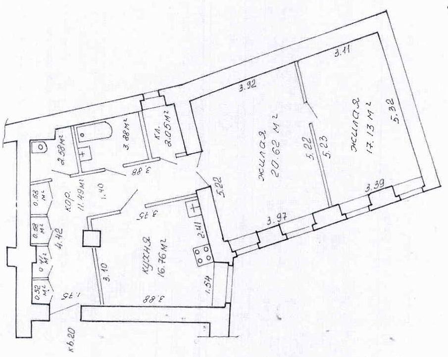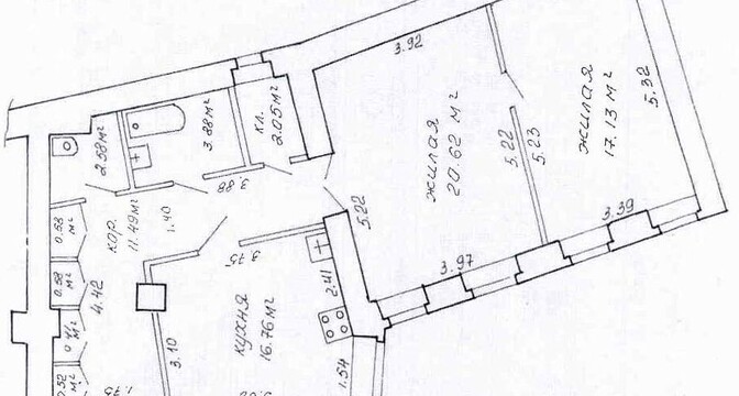 Точный адрес нашего объекта — улица Карла Маркса, 17, квартира 20. Дом кирпичный, построен в 1947 году. Планировка и конфигурация весьма необычны: прихожая со встроенными шкафами, раздельный санузел, кладовка, большая угловая кухня на 16,7 м2, две смежные комнаты (20,6 м2 и 17,1 м2).