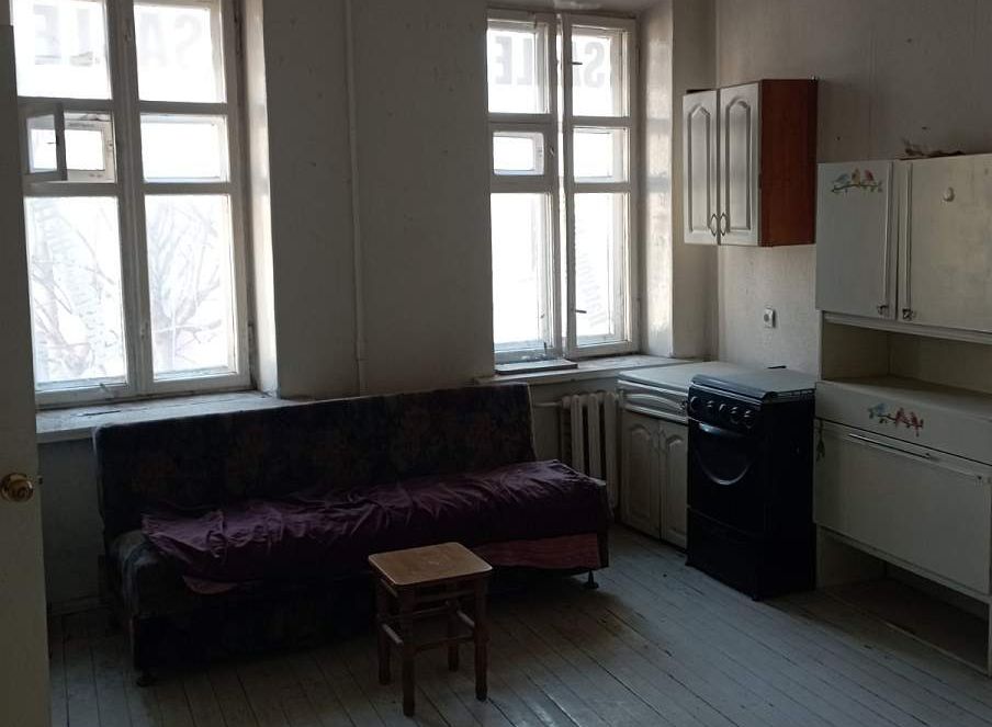 В квартире высокие потолки и большие окна, мебели нет. Внутреннюю отделку современной не назовешь — потребуется ремонт.