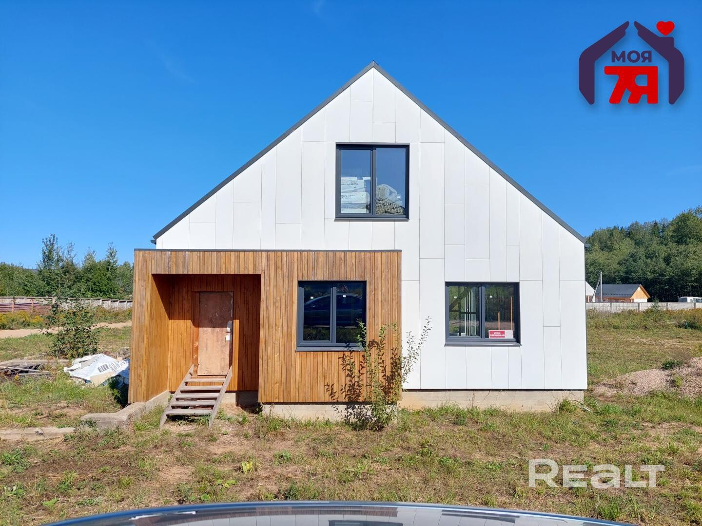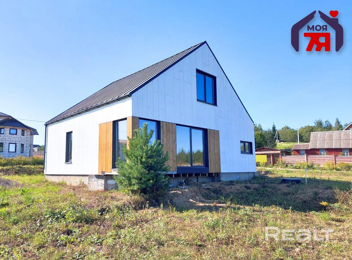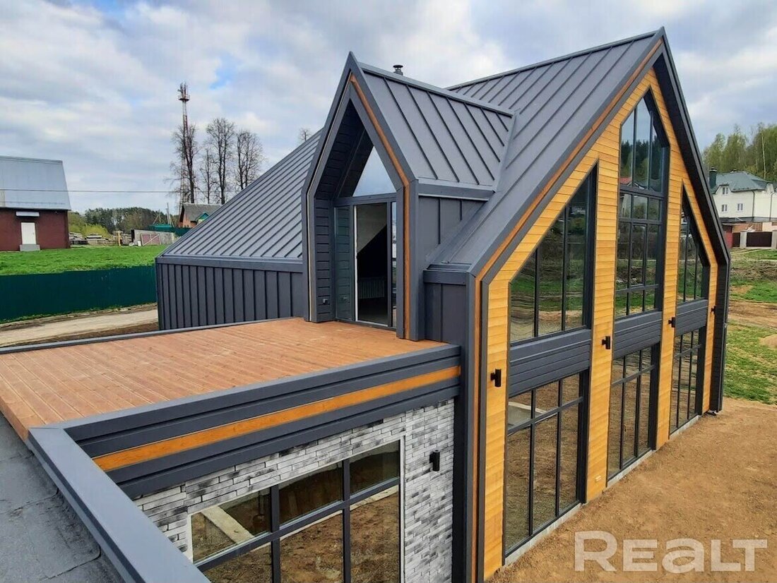 Можно и дешевле стильный вариант подыскать — вот, например, двухуровневый каркасный дом 2020 года постройки. Общая площадь — 115,3 м2. Фасад оюбщит крашенным ЦСП, кровля фальцевая. Внутри еще есть над чем поработать — стены и потолки еще не зашиты гипсокартоном, нет перегородок.