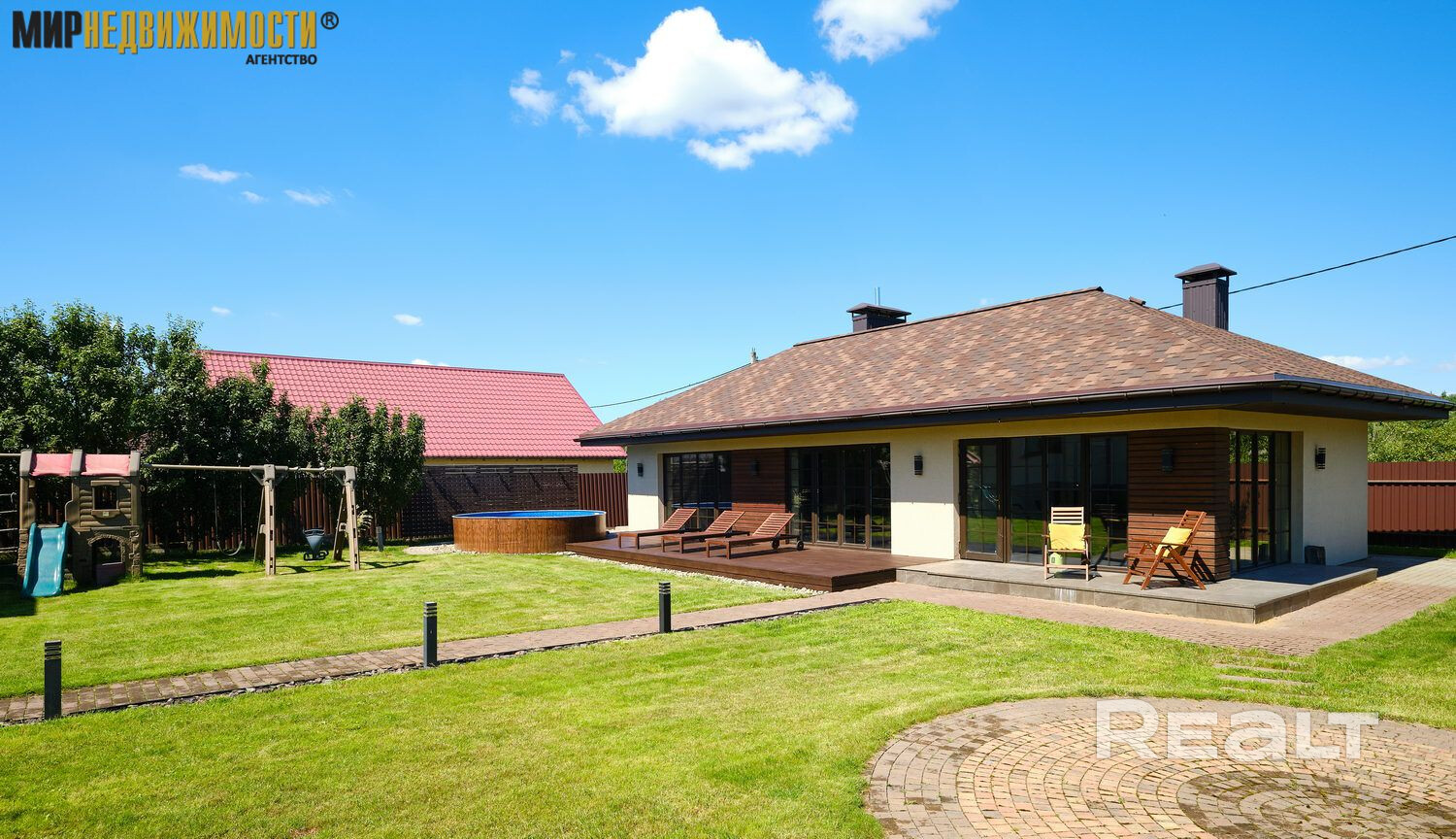 На участке 11 соток имеются навес на 3 машины, детская площадка, сезонный бассейн и гостевой дом с баней и террасой под чистовую отделку. В нем оборудована кухня с дровяной плитой и печью, камин-барбекю.