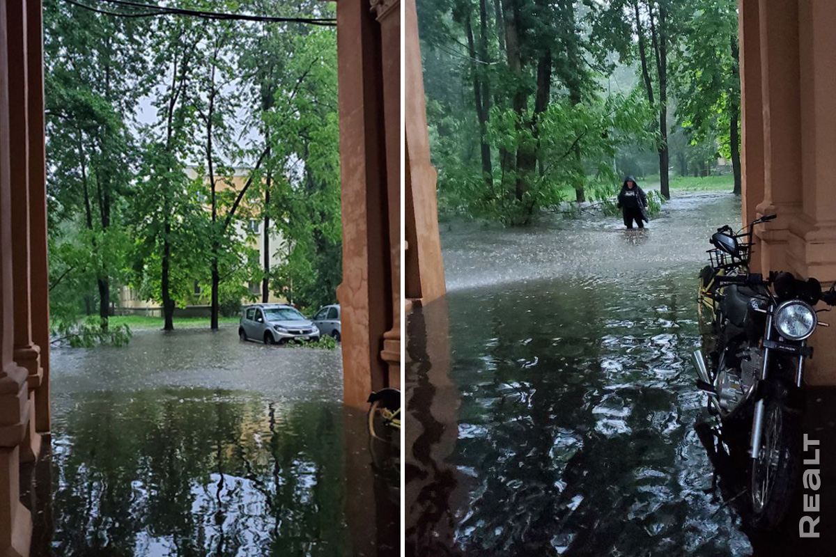 Хоть ливень и не был долгим, но за небольшое время успел оставить последствия, которые пришлось устранять сотрудникам МЧС. Спасатели выезжали на распиловку упавших деревьев и устраняли подтопления в автосалоне по улице Тимирязева и в здании Беларусбанка на проспекте Дзержинского.