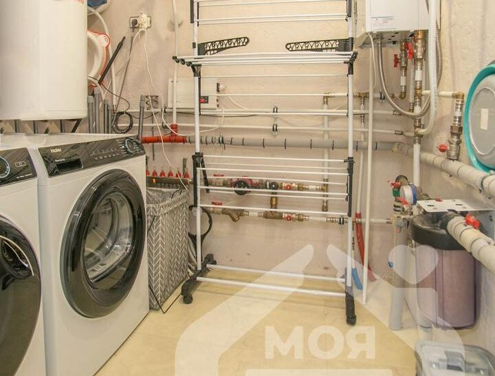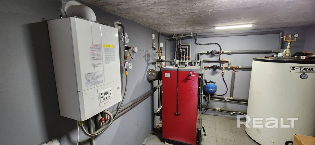 Отапливается дом газовым котлом (есть и твердотопливный), водопровод центральный, канализация местная, есть кондиционер.