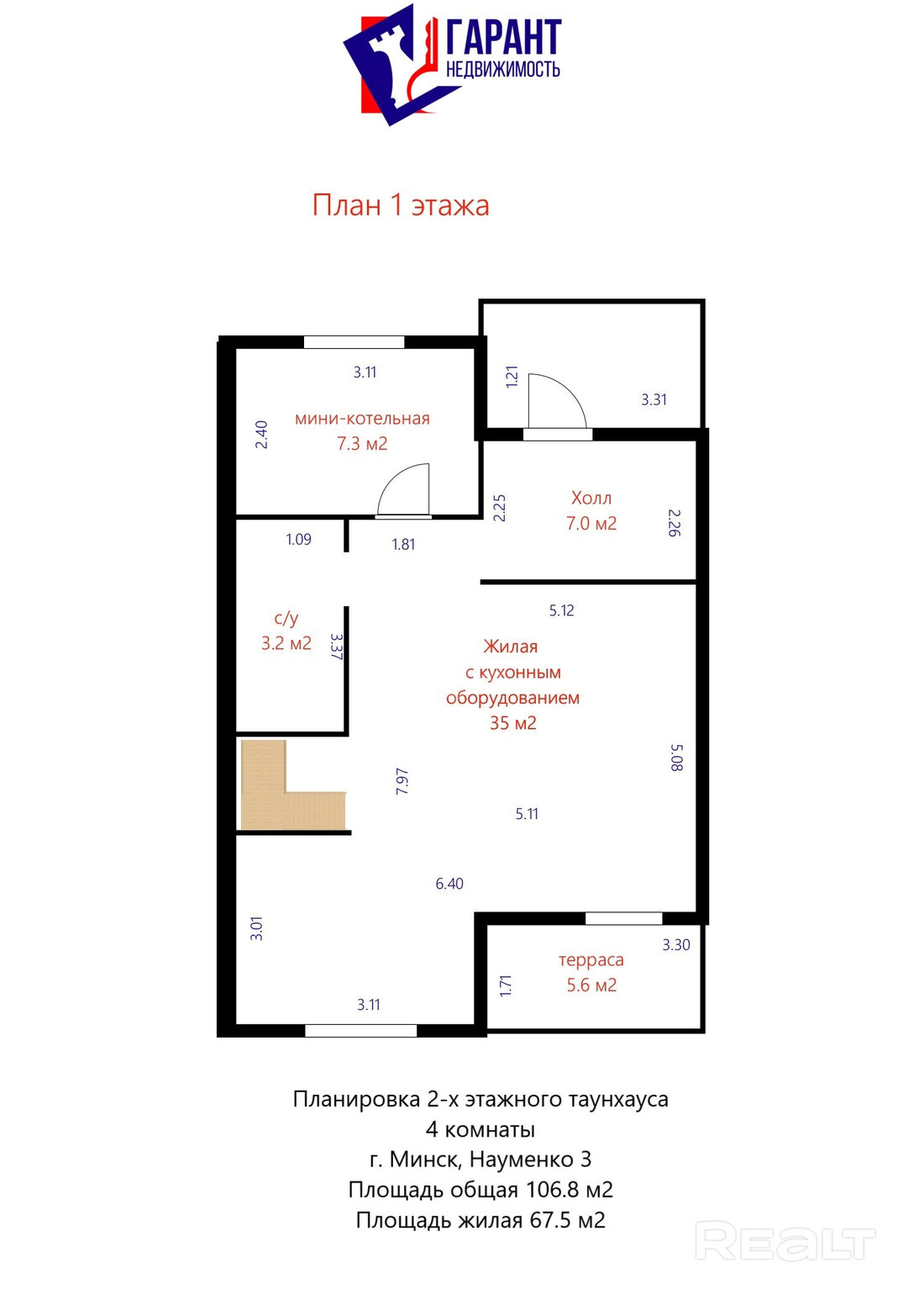 На первом этаже располагается прихожая, гостиная с большими окнами и кухня, объединенная с обеденной зоной. Отсюда же можно попасть на террасу и небольшую собственную территорию. На втором уровне находятся три спальни и просторная ванная комната.