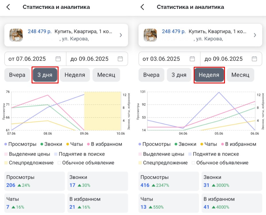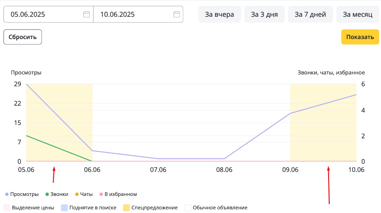 «Статистика и аналитика» — это сервис в вашем личном кабинете, который позволяет отслеживать интерес к вашему объявлению в режиме реального времени. Там показывается число просмотров, добавлений в избранное, а также звонков и открытий чата с вами. Там также можно выбирать период, за который вы хотите посмотреть активность.