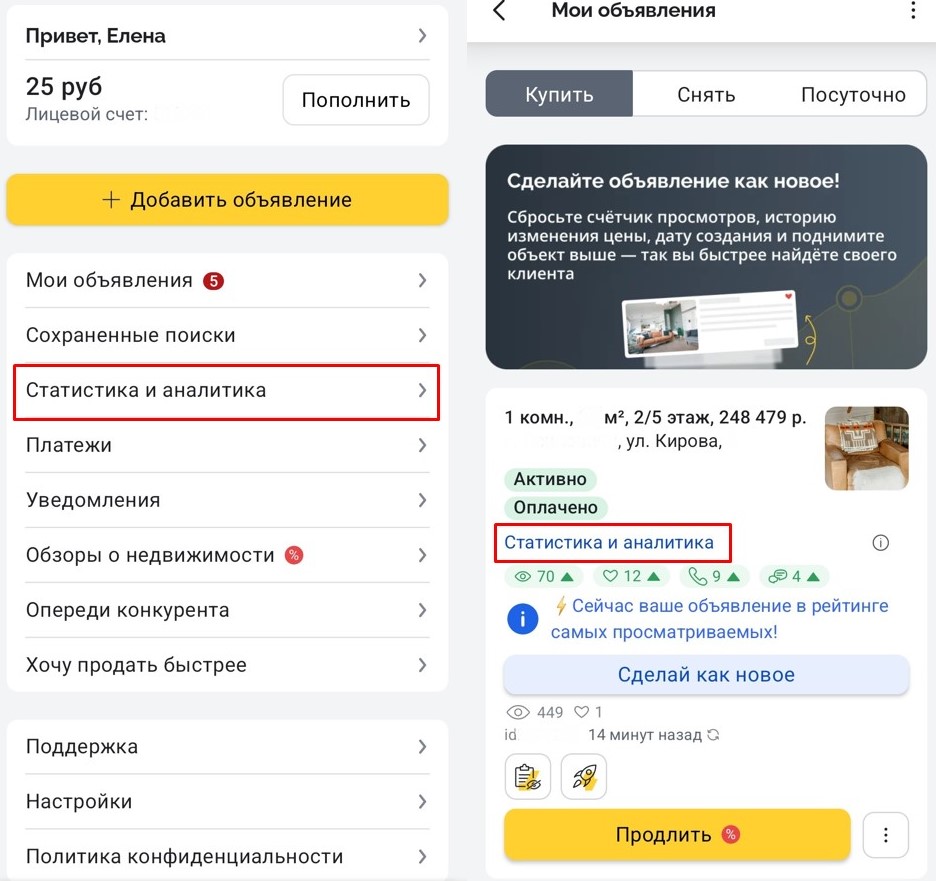 Заходим в раздел «Статистика и аналитика». В него можно попасть как из личного кабинета, так и с карточки своего объявления.