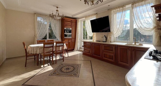 Вот, например, большой коттедж, в котором было бы не зазорно жить хоть графу, хоть князю — на 512 квадратах есть и спа-зона с сауной и бассейном, и камин в гостиной, и домашний кинотеатр с бильярдом, и гараж на две машины.