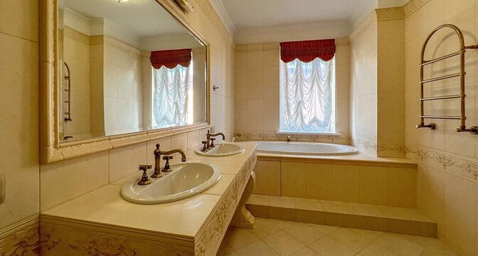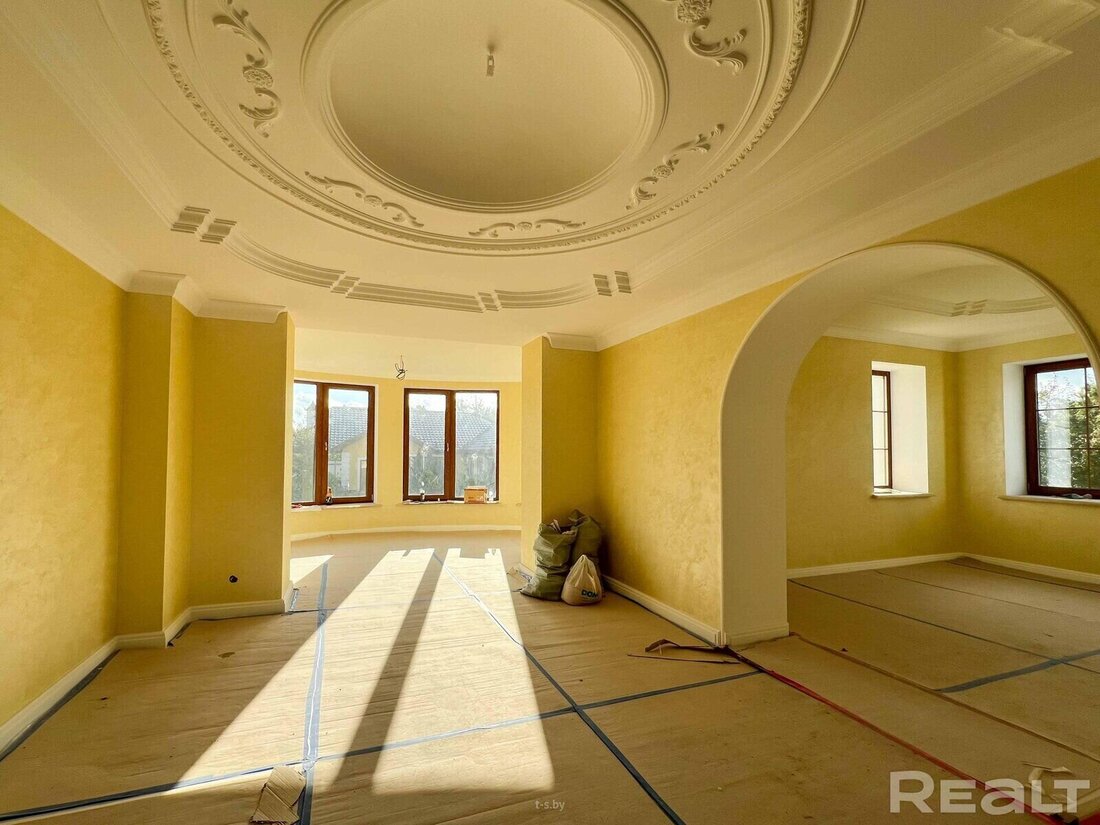 Внутри интерьеры в классическом стиле и просторные комнаты. Отделка еще не закончена, но все инженерные системы уже работают.