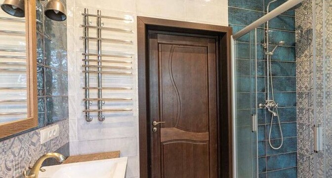 Интерьер стильный, с интересными решениями в виде деревянных балок перекрытий и использованию ярких акцентов в оформлении стен. Полы жилых помещениях деревянные, в санузлах, топочной, на кухне — плитка с подогревом.