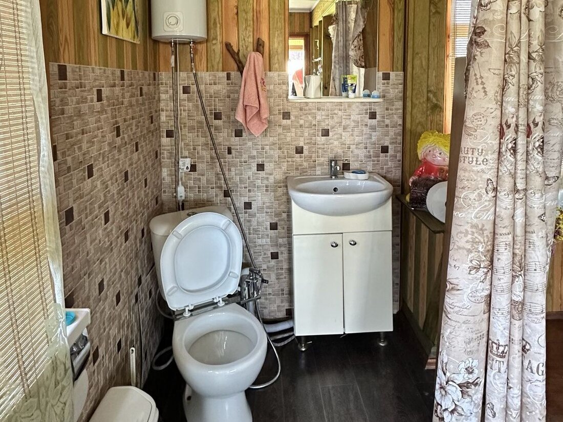 На участке 10 соток имеется еще и гостевой дом с дровяной печью и электрическим теплым полом. Кроме него еще три постройки: беседка с мангальной печью и плитой под казан, раковиной, гараж для садовой и мототехники и погреб для хранения.