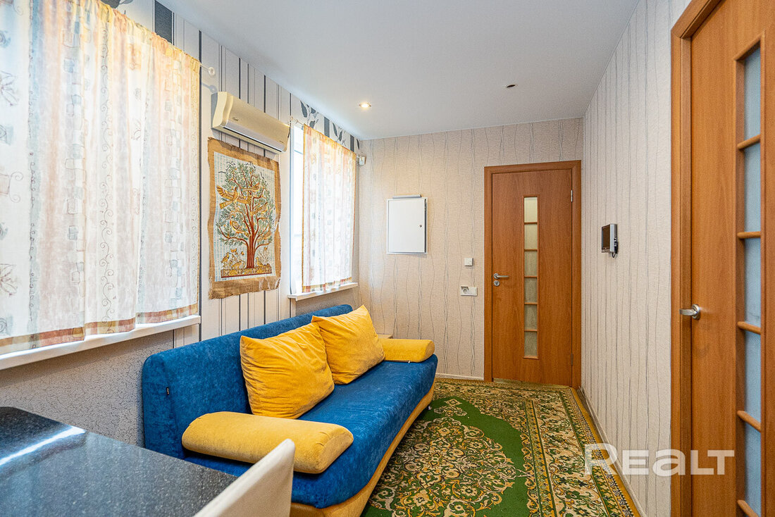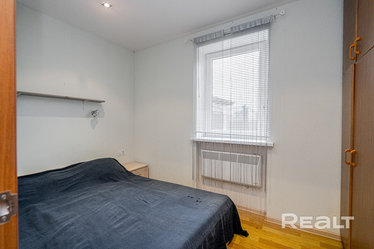 На первом этаже расположены кухня, гостиная, жилая комната и санузел. На втором — еще две спальни.