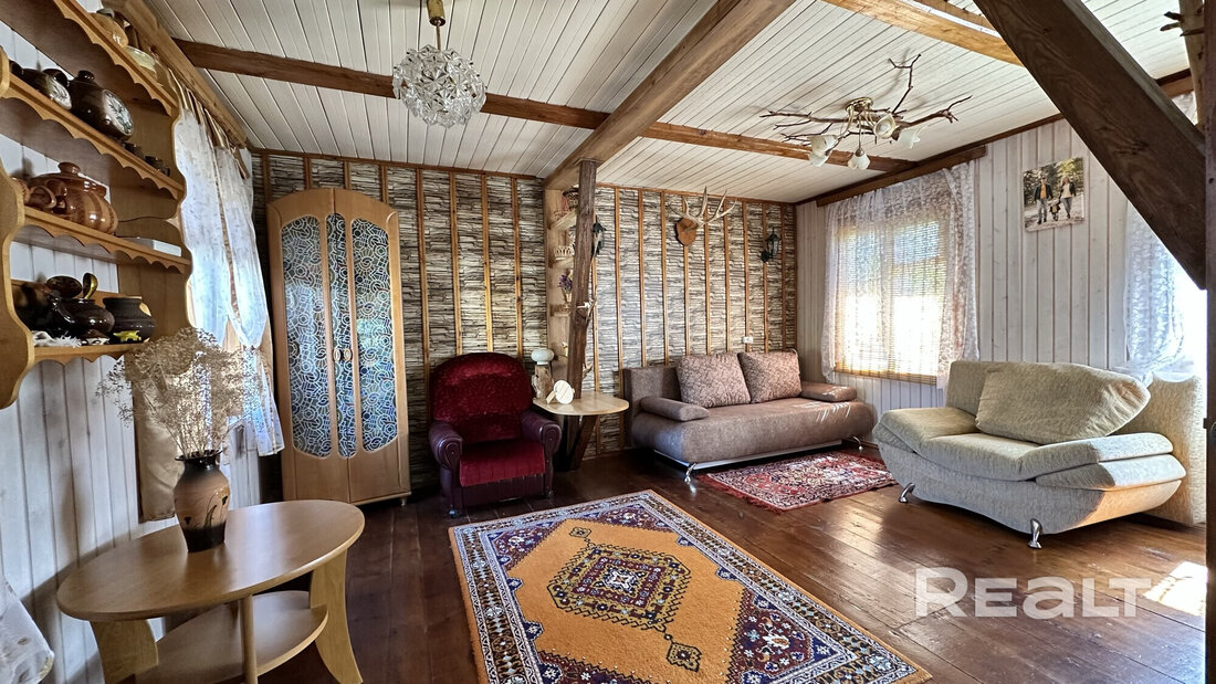 Общая площадь — 116,8 м2. В нем пять жилых комнат, кухня и санузел. В цокольном этаже находятся баня с душевой, парилкой и комнатой отдыха. Плюс большой сухой погреб.