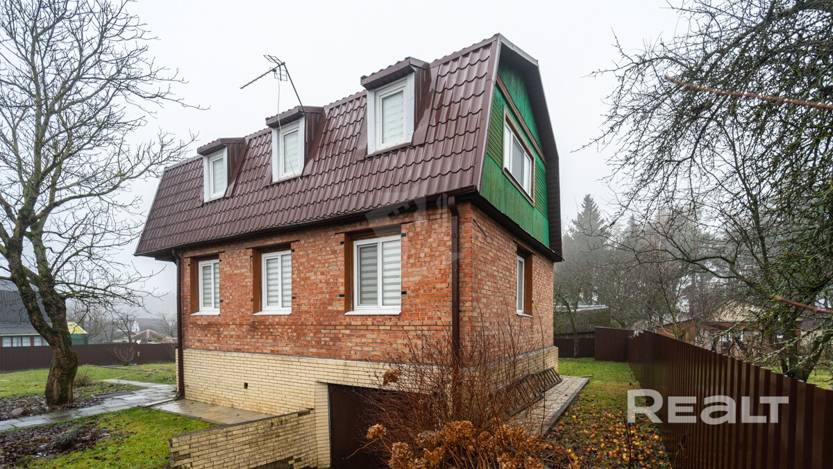 Здесь продается уютная дача площадью 94,4 м2 с мансардой. Дом построен из газосиликатных блоков и облицован красным кирпичом. Окна деревянные, крыша шиферная.