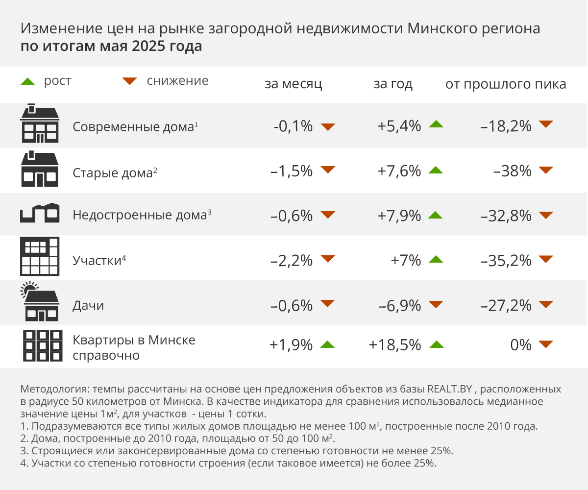 В мае 2025 года в Минске и Минской области купили почти на 12% больше домов, чем в апреле. И примерно столько же, сколько в мае 2024-го. А вот цены по сравнению с апрелем просели. Что еще произошло на рынке загородки — в аналитике Realt.