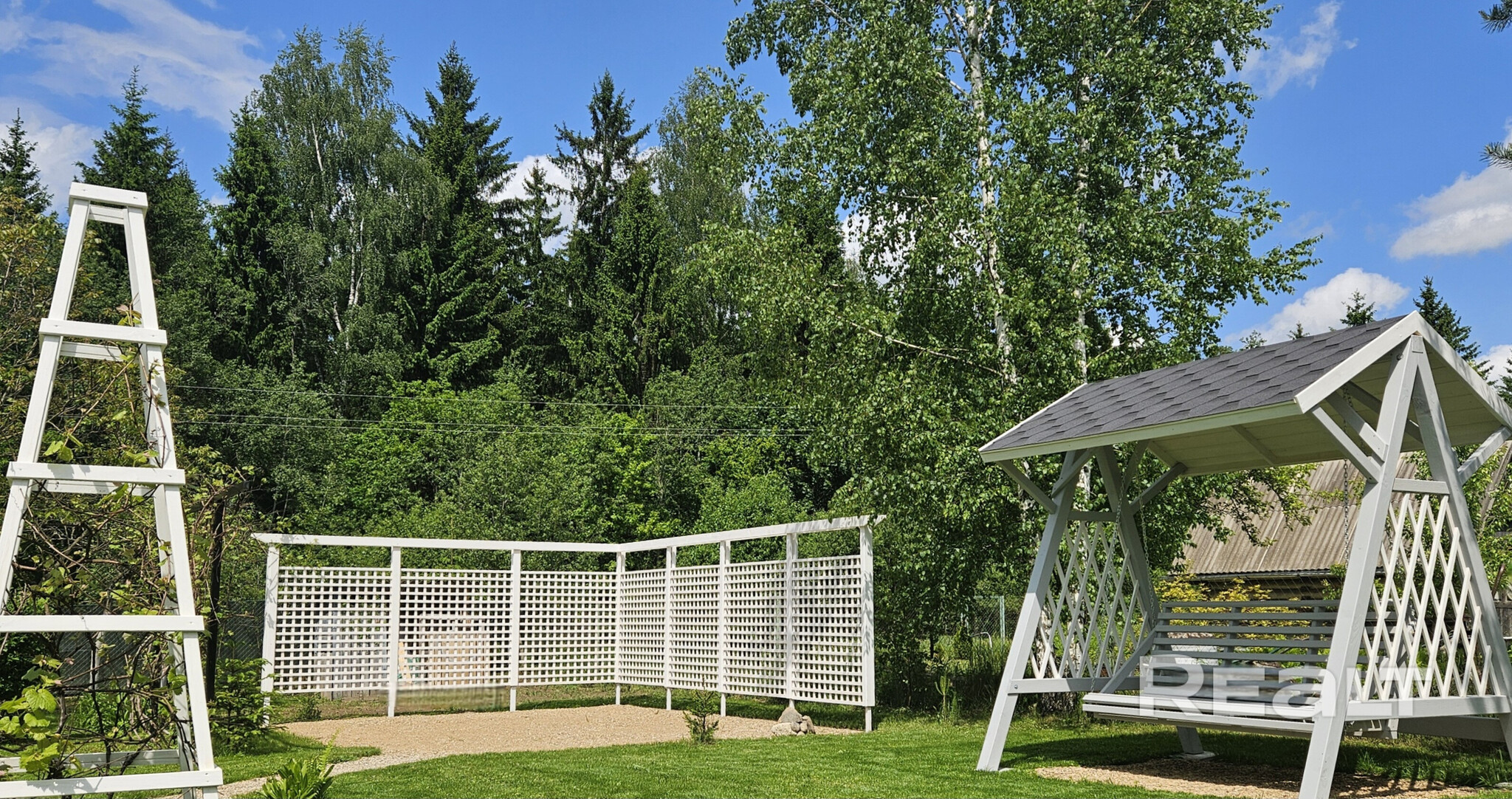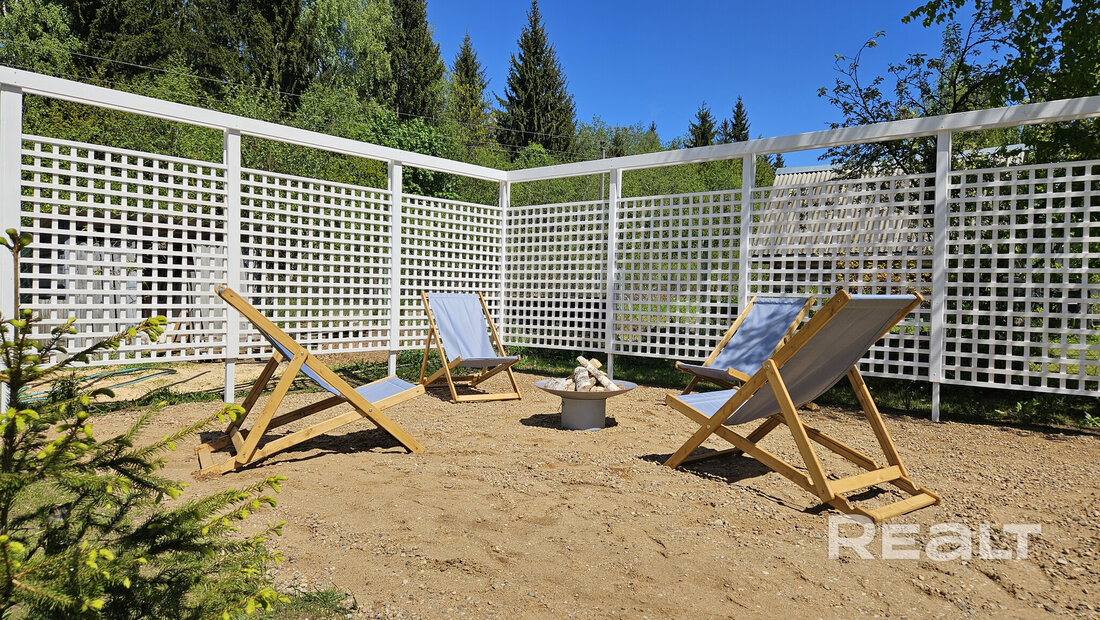 Участок занимает 8 соток и находится рядом с лесом. Сама территория благоустроенна: все огорожено, есть парковка, качели, организована зона отдыха у костра.