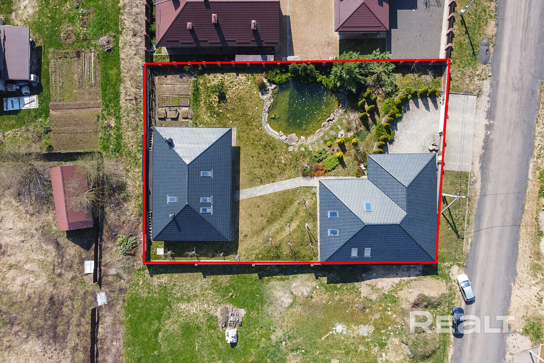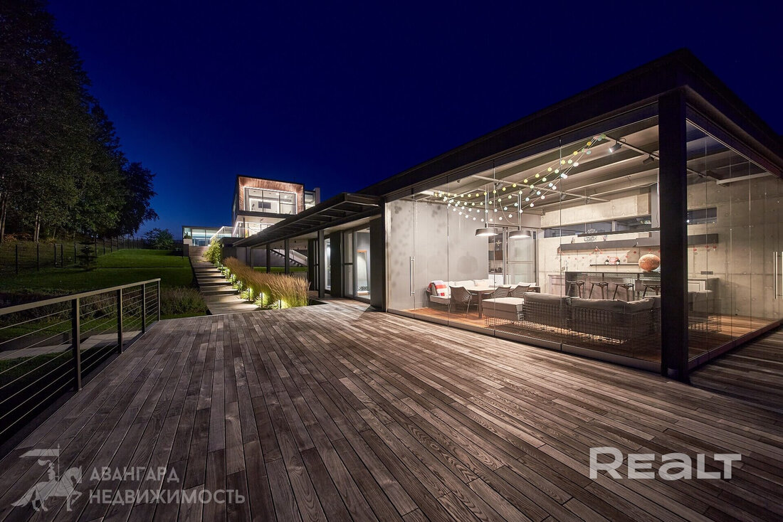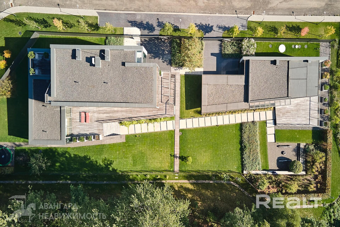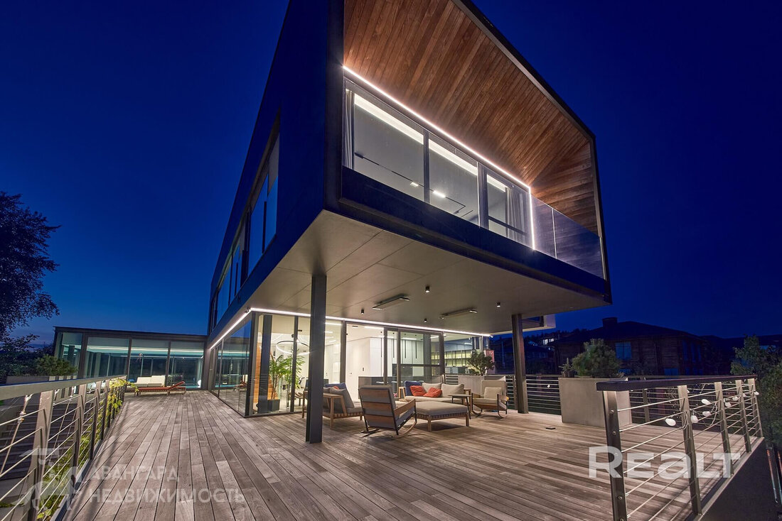 Домовладение состоит из двух современных зданий в едином стиле — гостевой дом (117,8 м2) и хозяйский (728,4 м2). Введены в эксплуатацию в 2020 году. Оба дома отличаются современным монолитным строительством с прочными железобетонными сваями в основании, фасады домов облицованы крупноформатным керамогранитом белого и антрацитового оттенков. Акценты из термообработанного ясеня на террасах и части фасадов добавляют утонченности в архитектурный облик. Плоская кровля от FireStone завершает стильный и современный облик домов, подчеркивая их прямые линии и минималистичный дизайн. Сделана архитектурная подсветка.