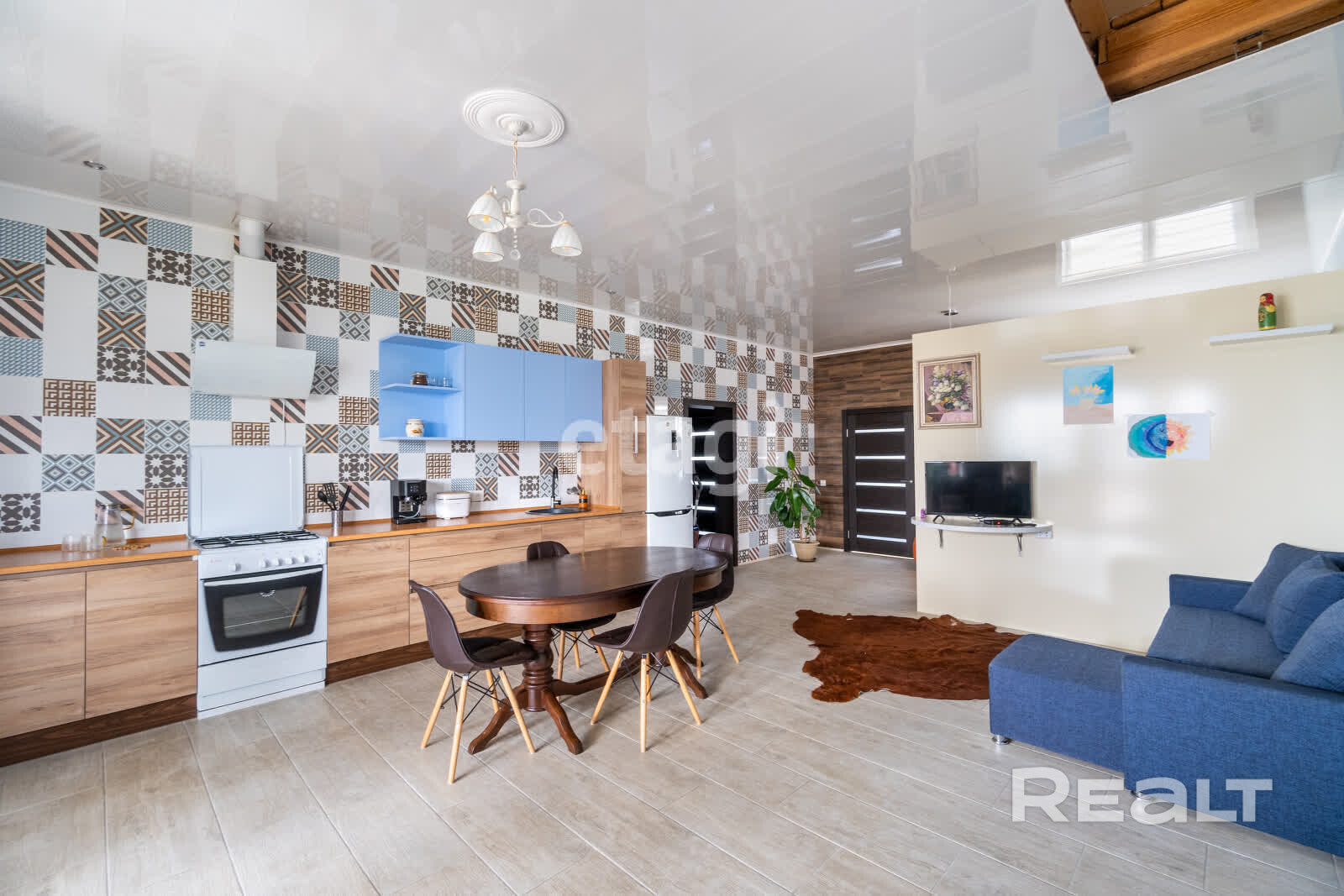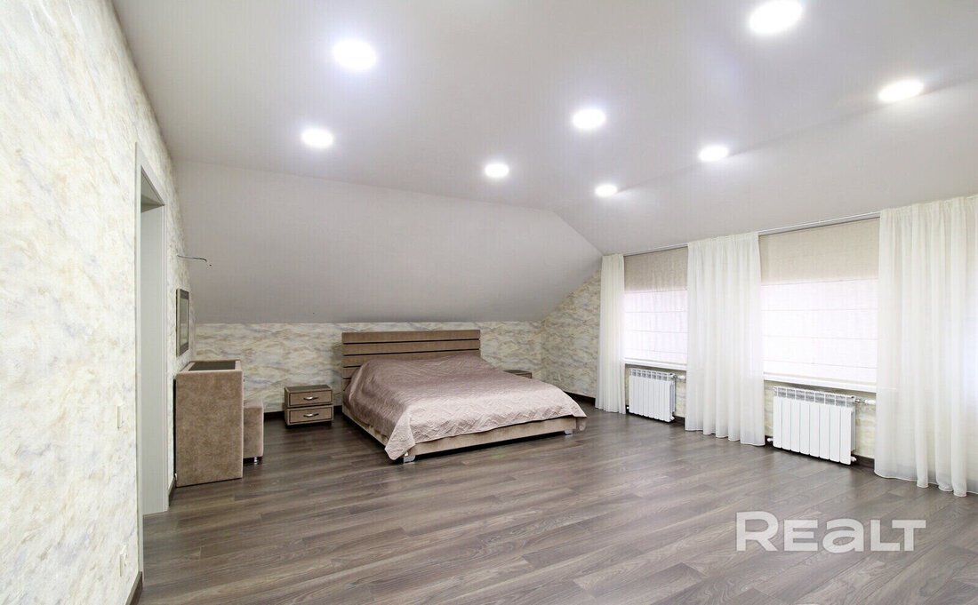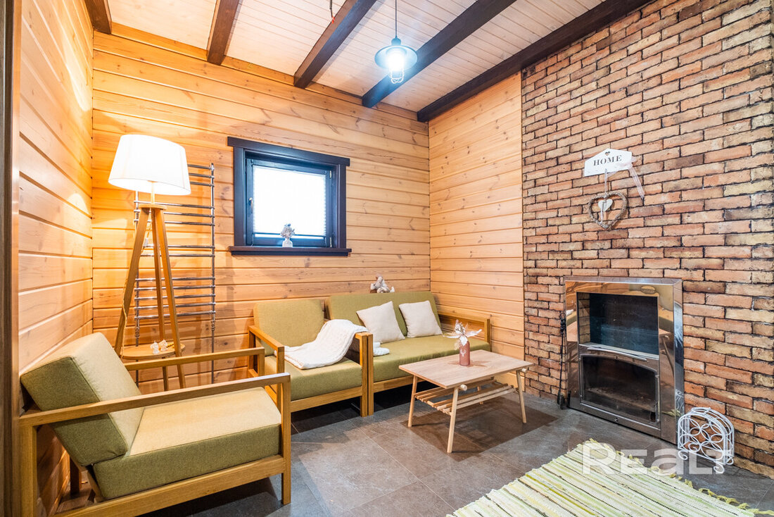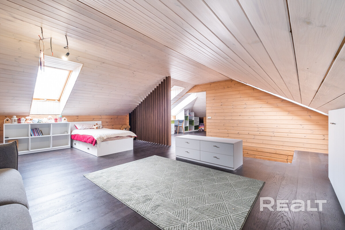 Общая площадь — 145,9 м2. Планировка такая: кухня-гостиная со вторым светом, два санузла, душевая, комната отдыха с камином, русская баня с местом для купели. На мансардном этаже находится жилая комната на 43 м2 с гардеробной комнатой.