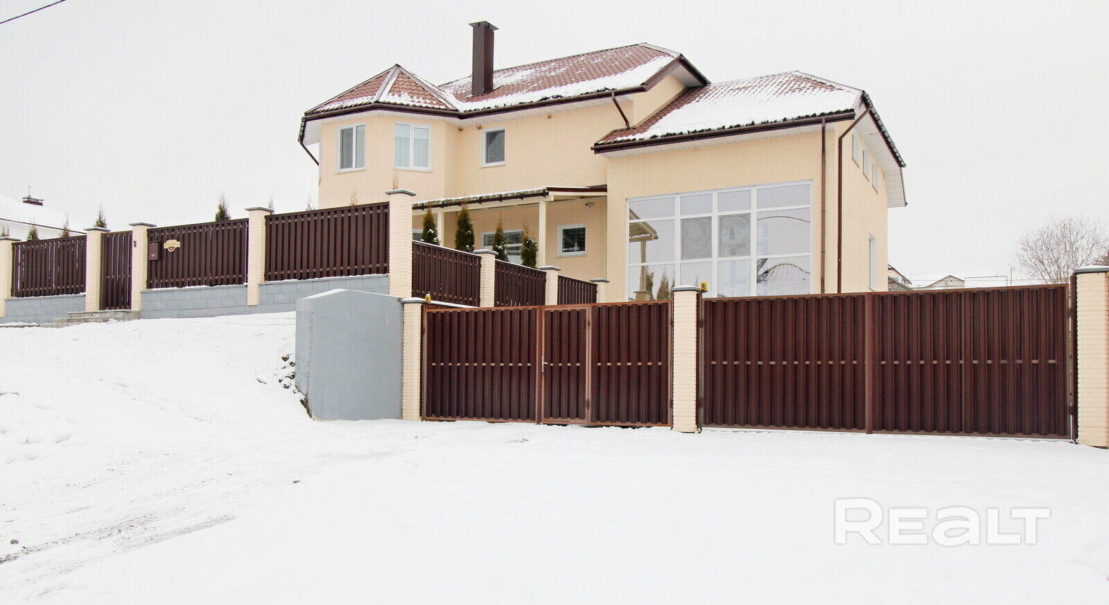 Есть дома побольше и подороже. Вот, например, коттедж в трех уровнях, с гаражом. Общая площадь — 400 квадратов. Материал стен — газосиликатные блоки, утеплены, оштукатурены и окрашены. На крыше — металлочерепица.