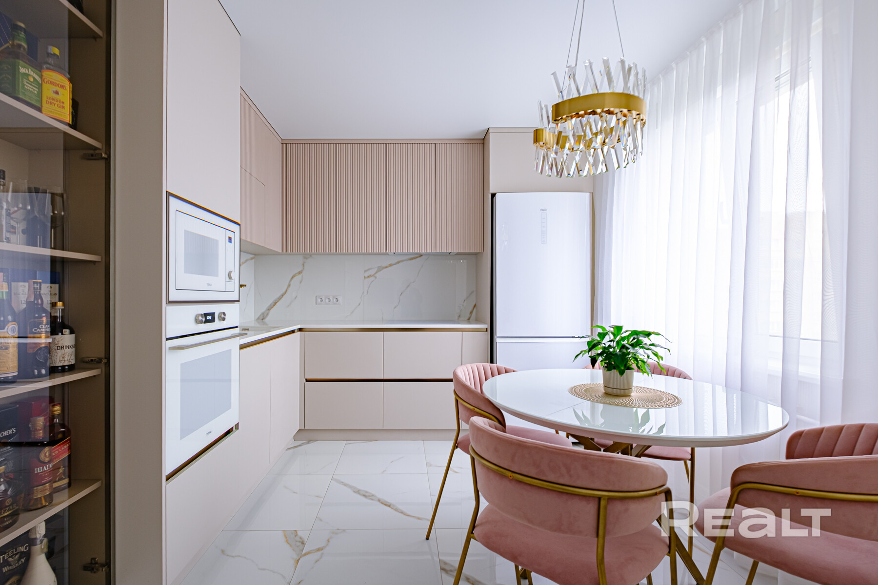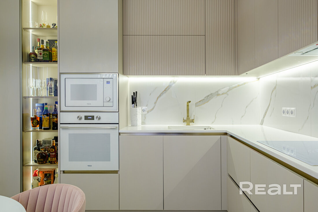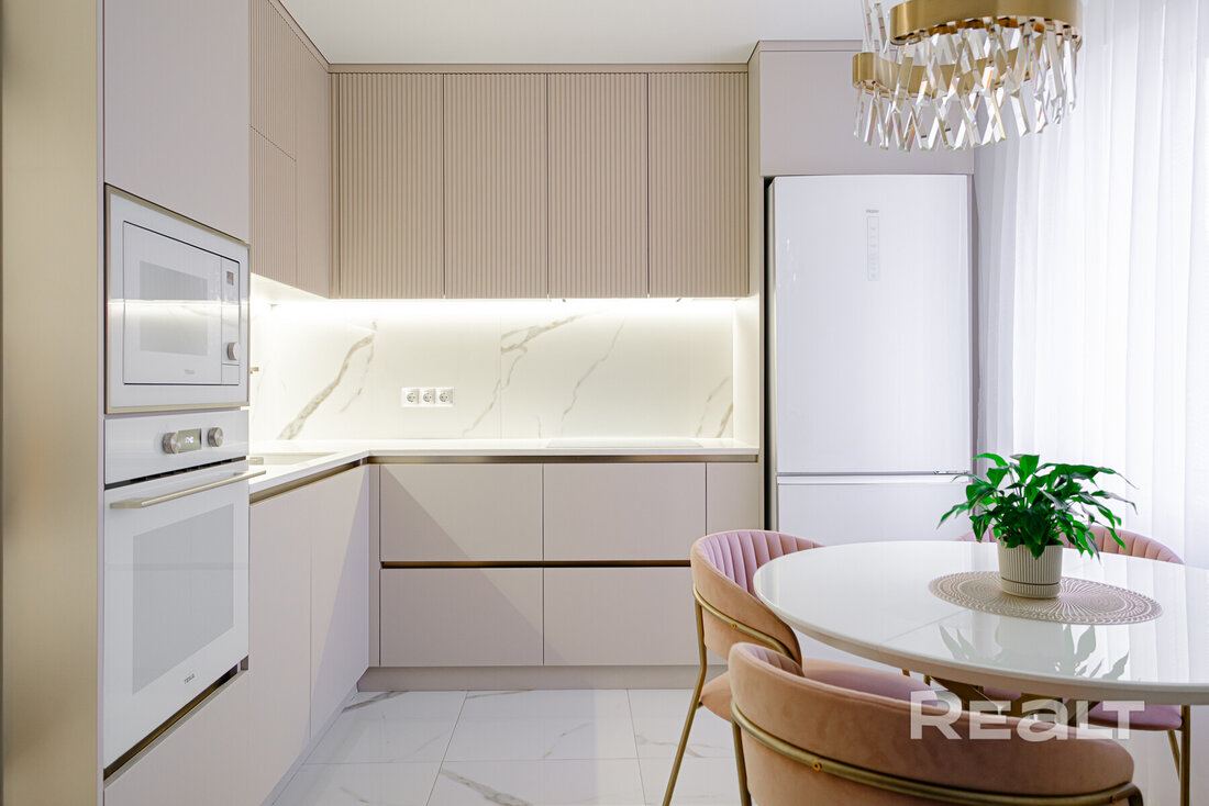Кухня выполнена в приглушенно-розовом цвете. Рабочая поверхность — из камня. Есть варочная панель, духовой шкаф и микроволновка.