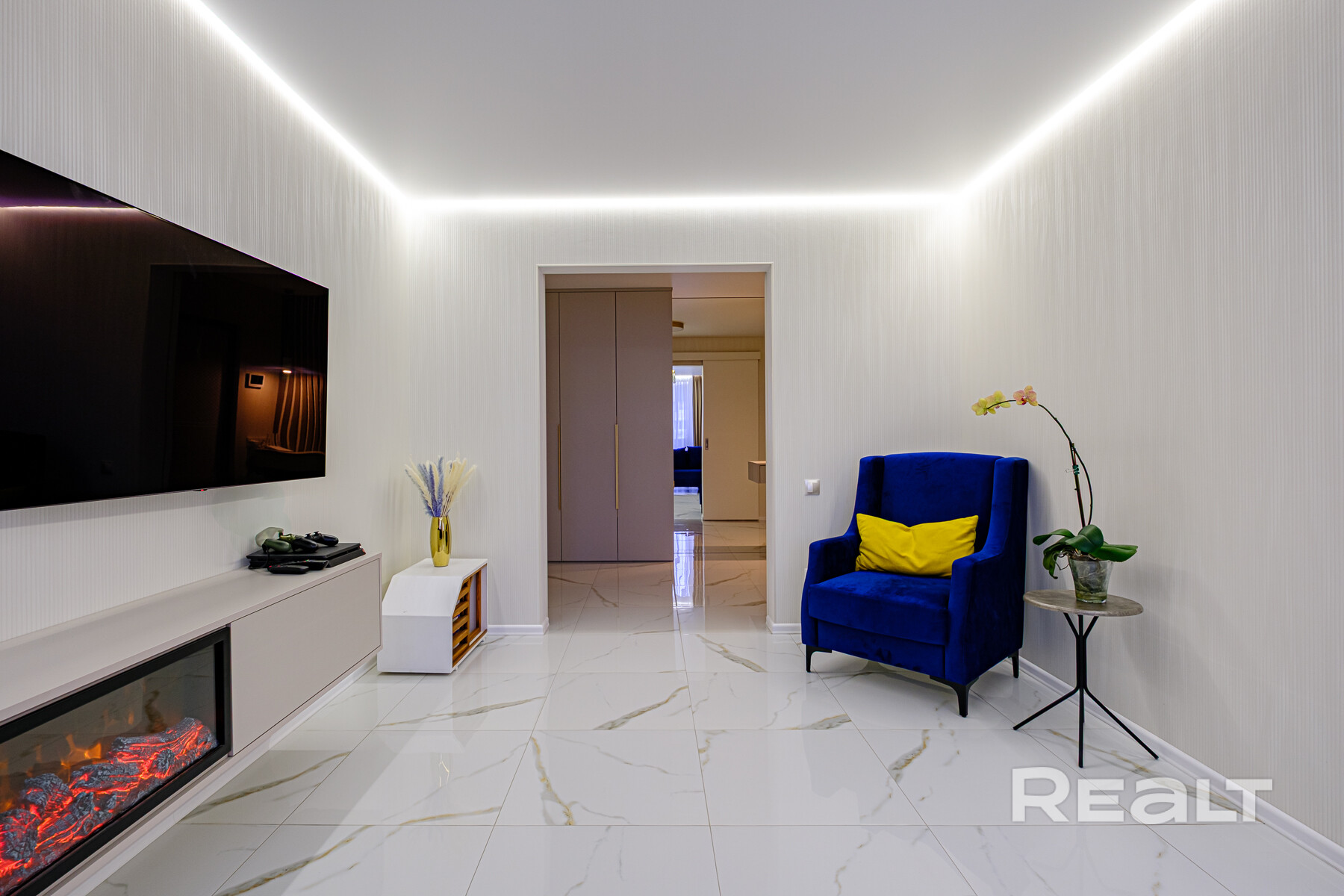 В гостиной — широкие раздвижные двери. Напольное покрытие то же — светлая плитка с подогревом под мрамор. Потолки натяжные, на стенах обои.