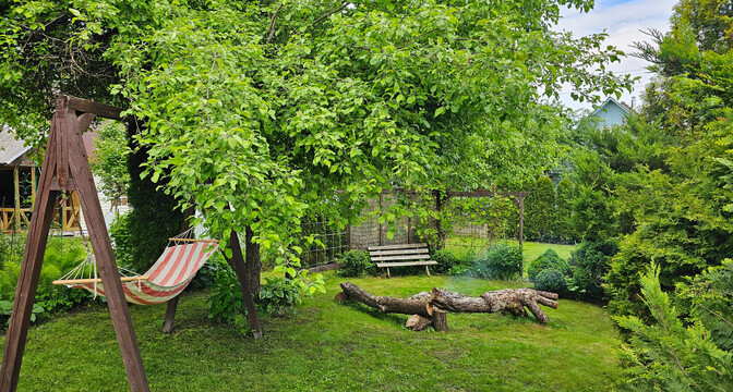 На небольшом участке в 4,2 сотки организованы кострище, гамак, лужайка для шезлонгов, есть место для обустройства небольшого огородика из высоких грядок.