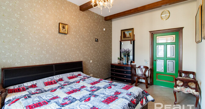 Есть зал с камином, спальня, кабинет, гардеробная и санузел. Все комнаты очень просторные. Потолки в квартире трехметровые. Есть выход на застекленную лоджию.