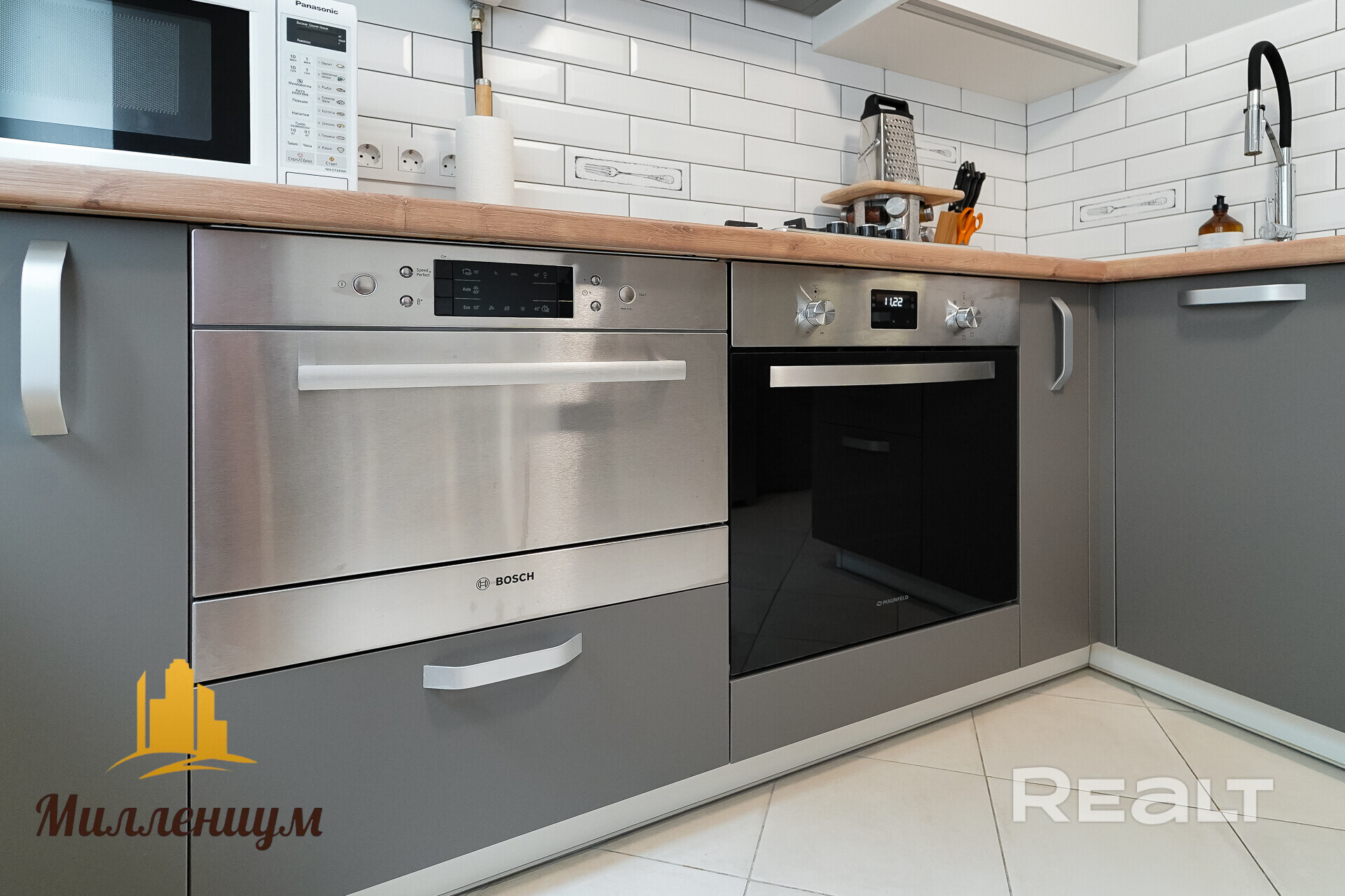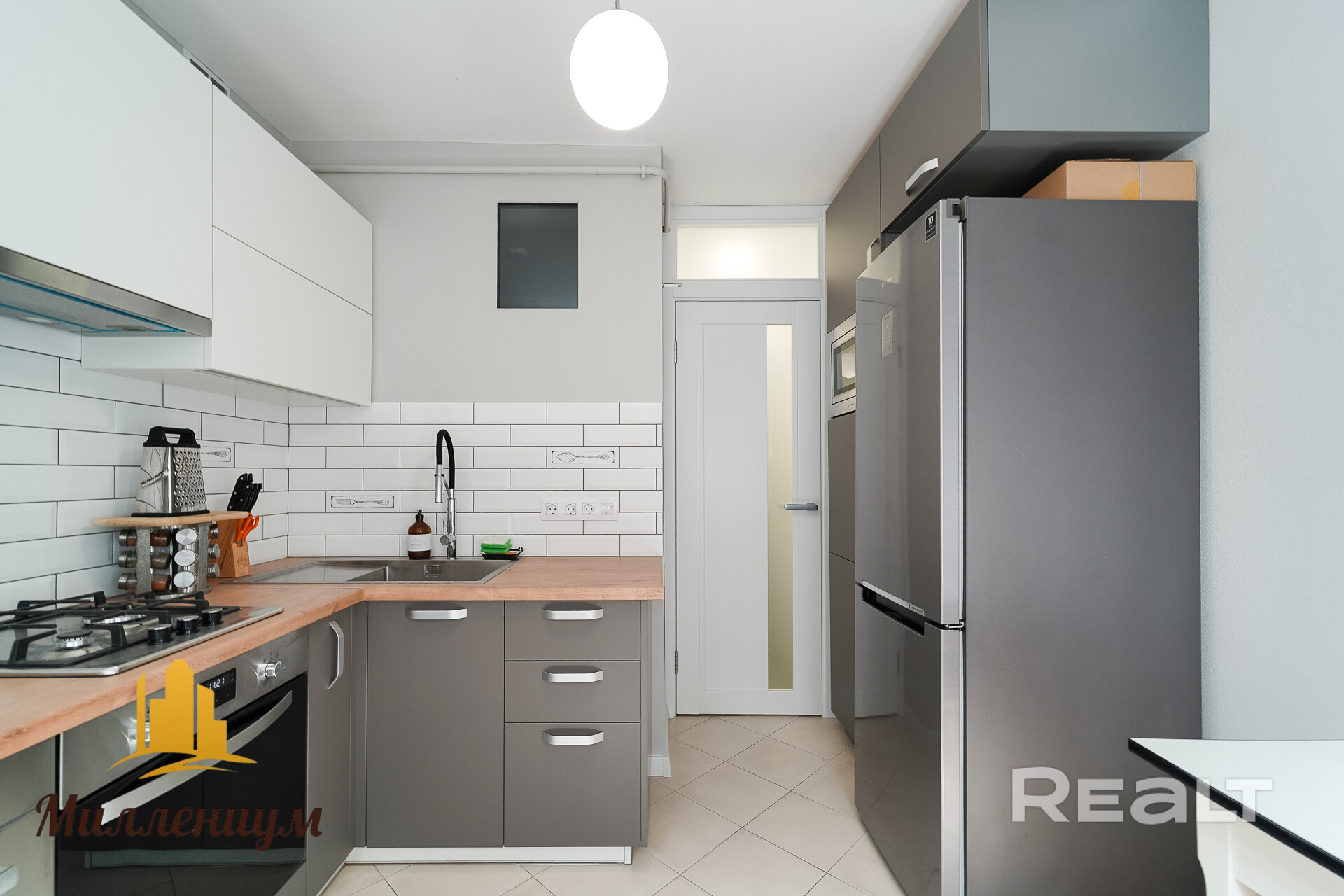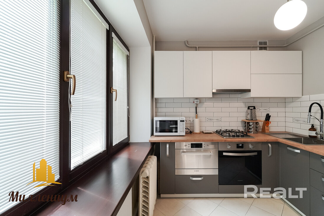 Квартира расположена на первом этаже. Ее общая площадь — 55 квадратов, жилая — 35 метров. Площадь кухни — 8 метров. Из техники в кухне есть духовой шкаф, газовая плита, вытяжка, холодильник и встроенная пароварка. Фасады выполнены в светлом и сером цветах.