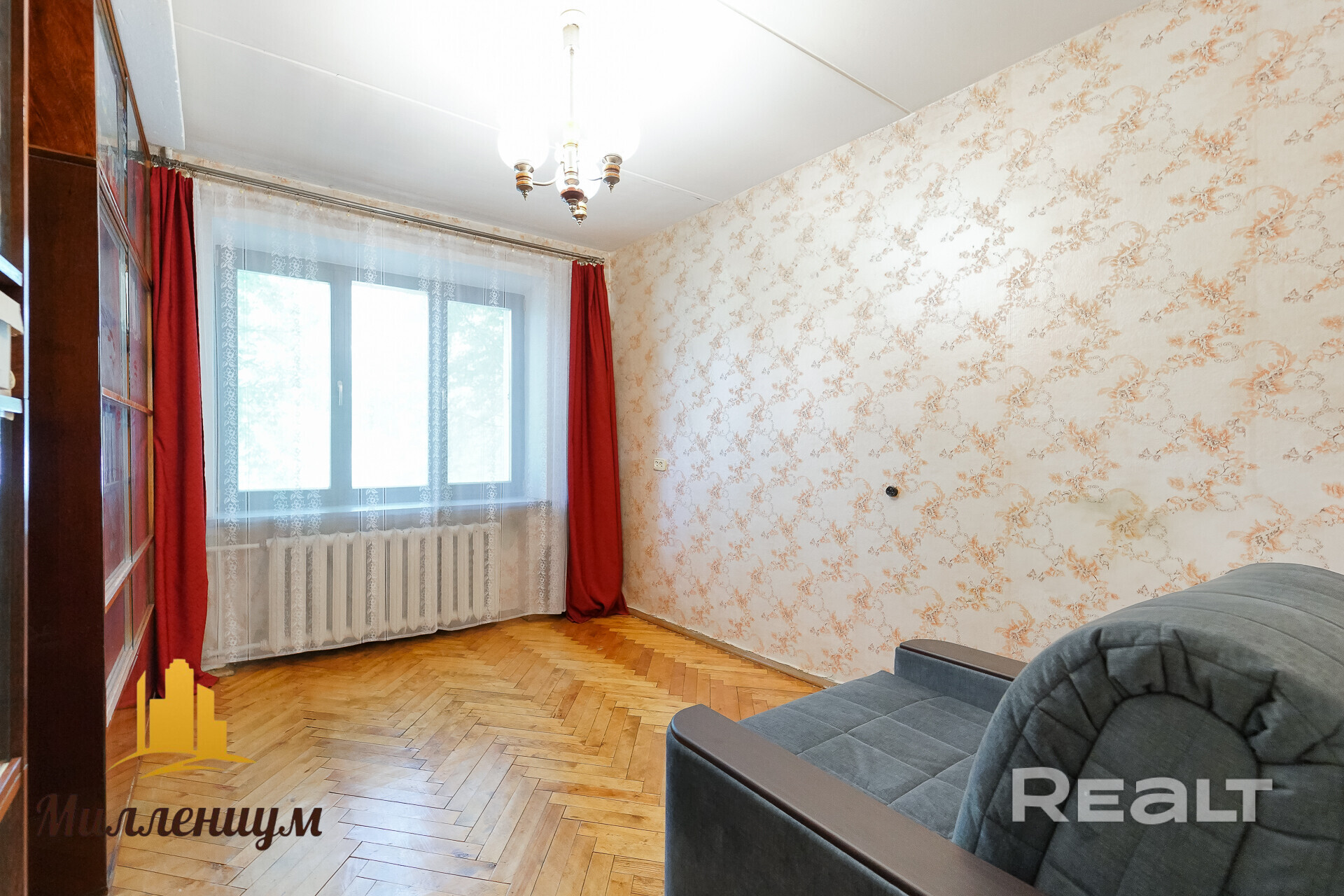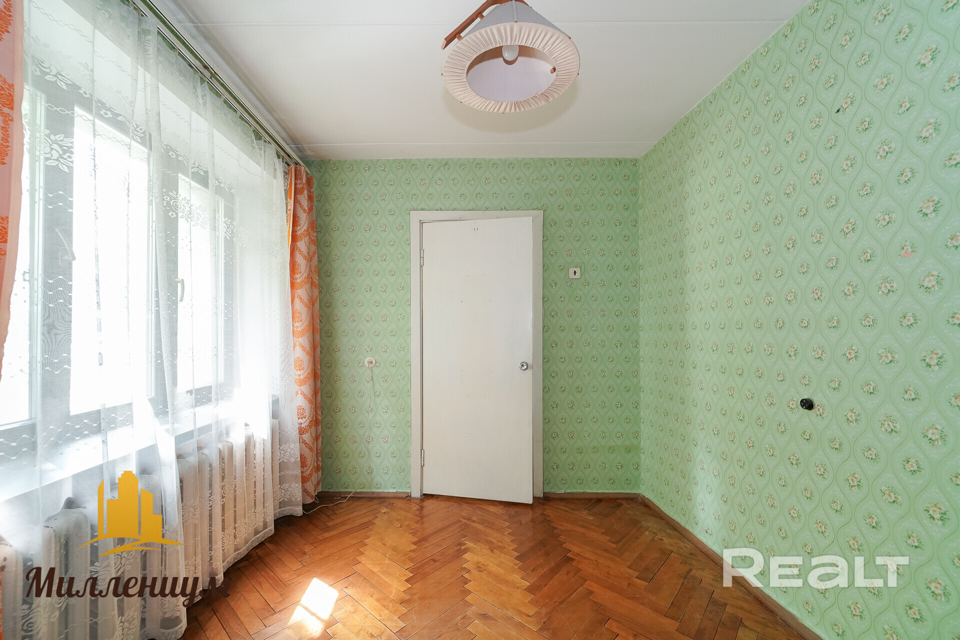 В жилых комнатах ремонт не делали. Здесь все выглядит так, как было в доме в первозданном виде. Из приятного — на полу лежит паркет в неплохом состоянии, который после реставрации может отлично выглядеть и гармонировать с современным ремонтом.