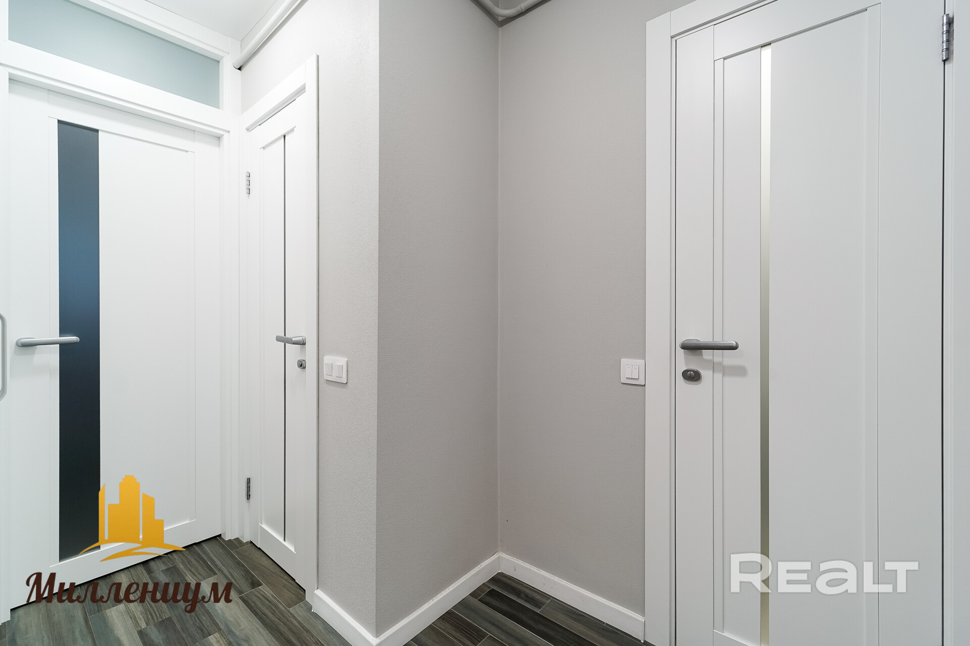 Ремонт в прихожей тоже выполнен в светлых тонах — серые стены, белые плинтуса и двери.