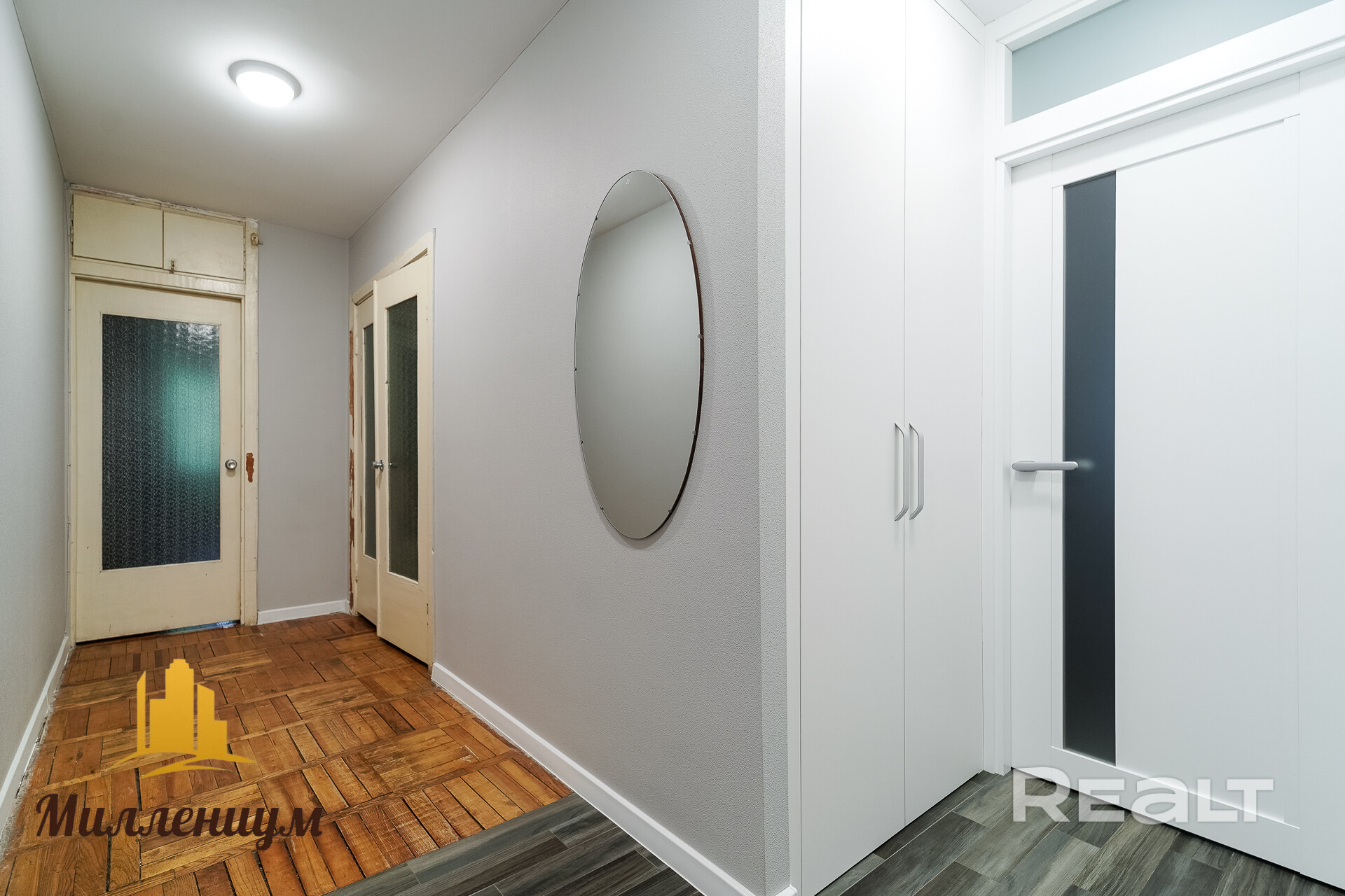 Судя по ремонту, который выполнен частично, можно предположить, что его начали, но не закончили. Пол в прихожей заменен не полностью, также частично оставлены и старые двери. Вот такое сочетание эпох в одной комнате.