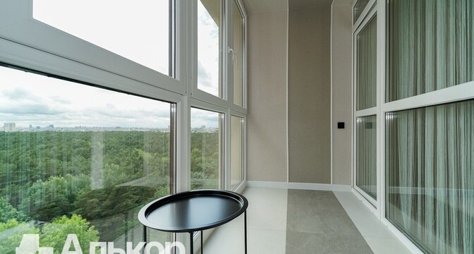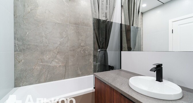 Квартира-студия на 13-м этаже. Общая площадь — 38 квадратов. Ремонт выполнен в нейтральных теплых тонах. Есть гостиная зона и спальное место. Остекление панорамное, есть выход на застекленную лоджию. В совмещенном санузле установлена ванна.