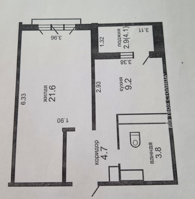 В гостиной есть выход на застекленную лоджию. Санузел раздельный. Установлена ванна.