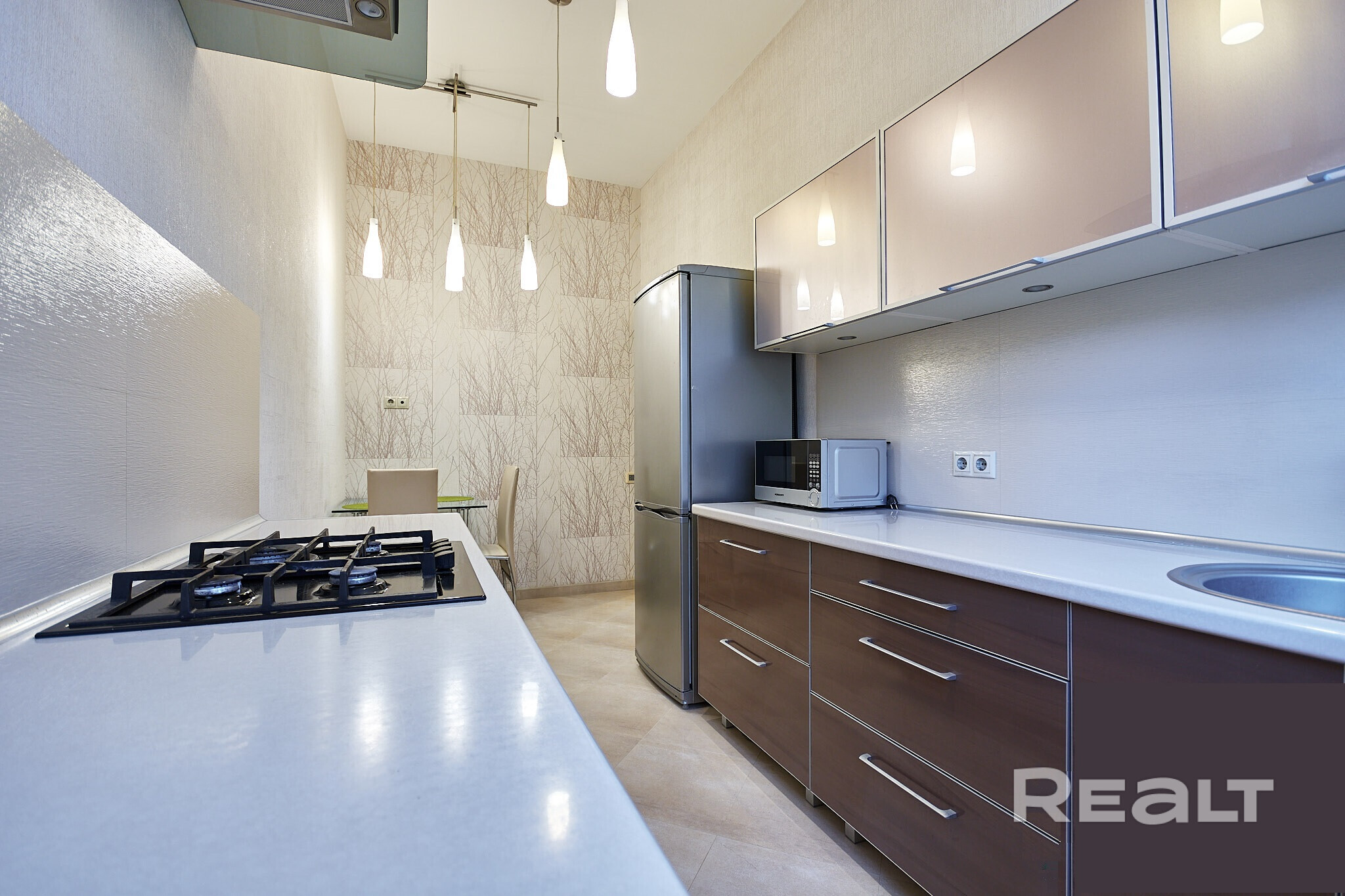 В кухне из техники есть духовой шкаф, газовая варочная панель, микроволновка, холодильник и вытяжка.