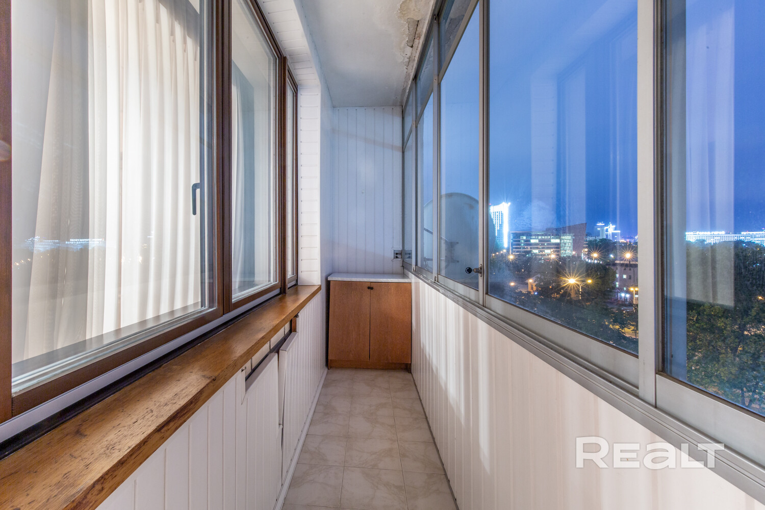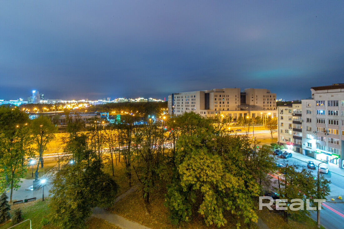 Из гостиной — выход на лоджию с видом на Банк Развития, парк Победы и Свислочь.