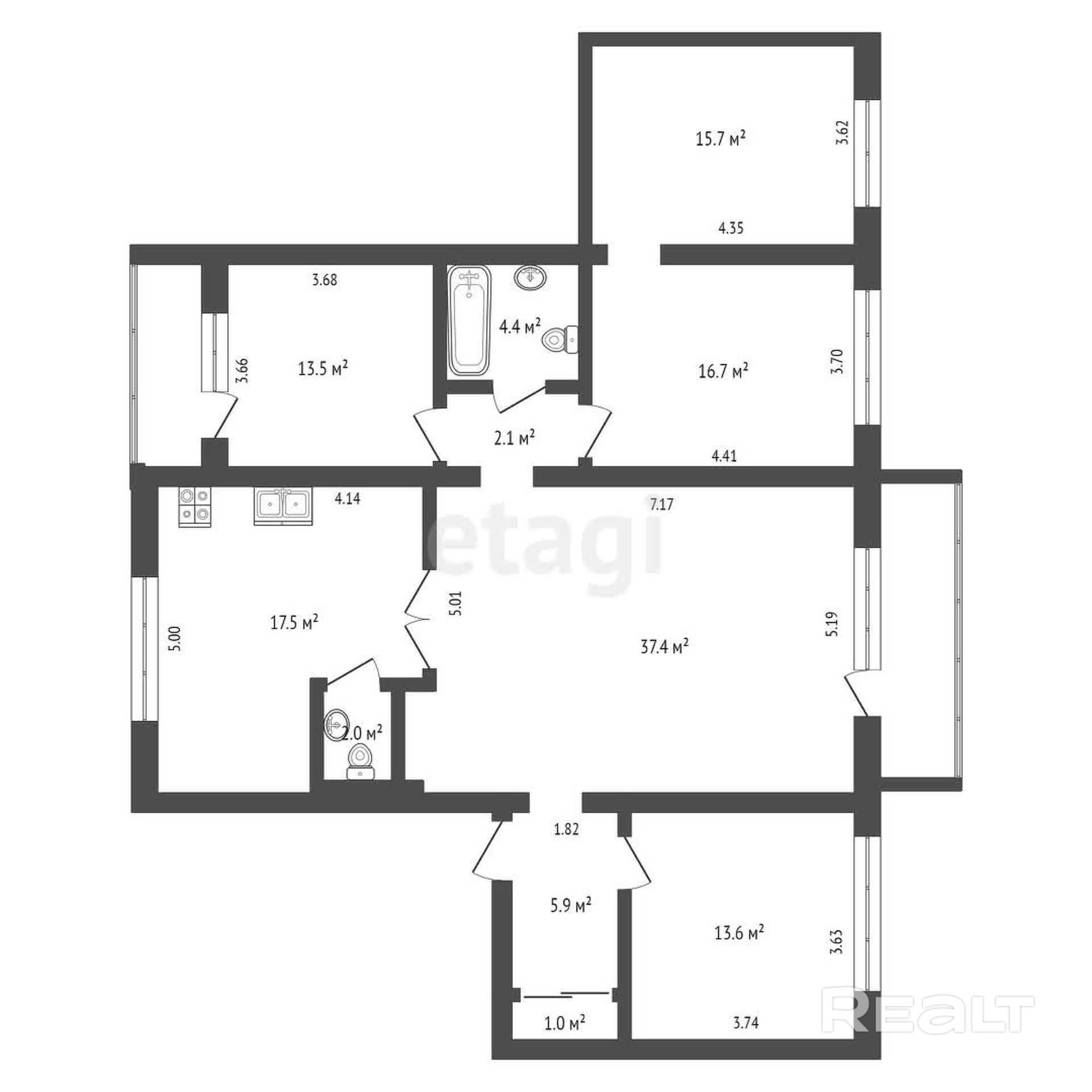 И одна из таких квартир продается на Realt. Это четырешка на 129,8 квадрата на седьмом этаже. У нее вот такая планировка: