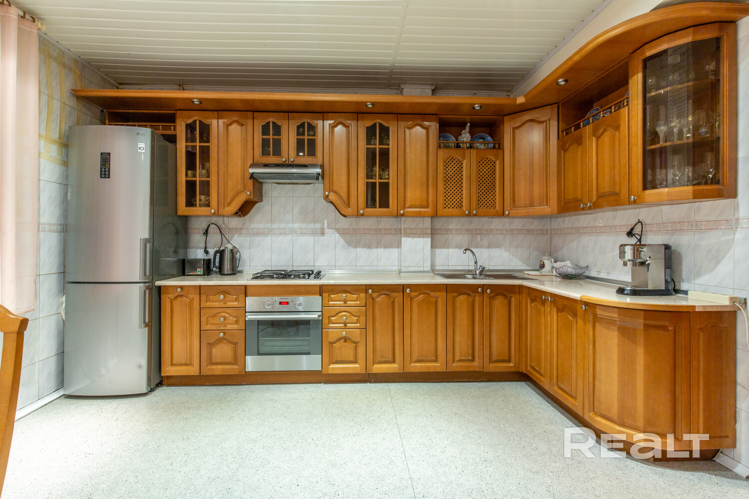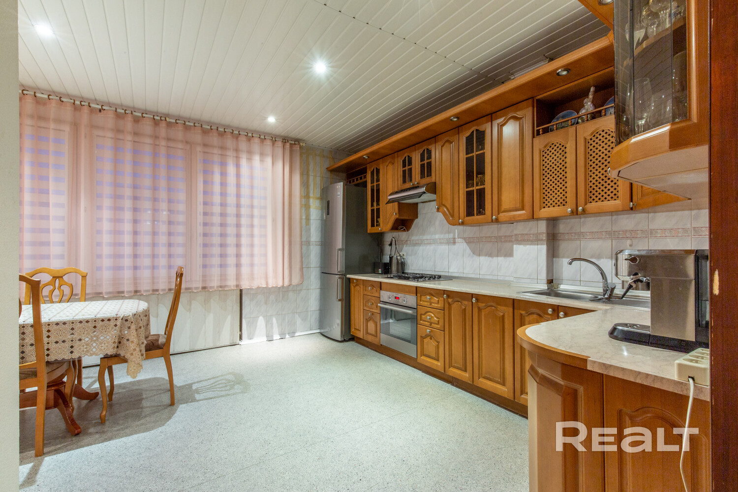 Кухня тоже огромная — 17,5 квадрата. И в ней тоже атмосфера достатка 90-х. Тут и деревянный гарнитур, и плитка на стенах.