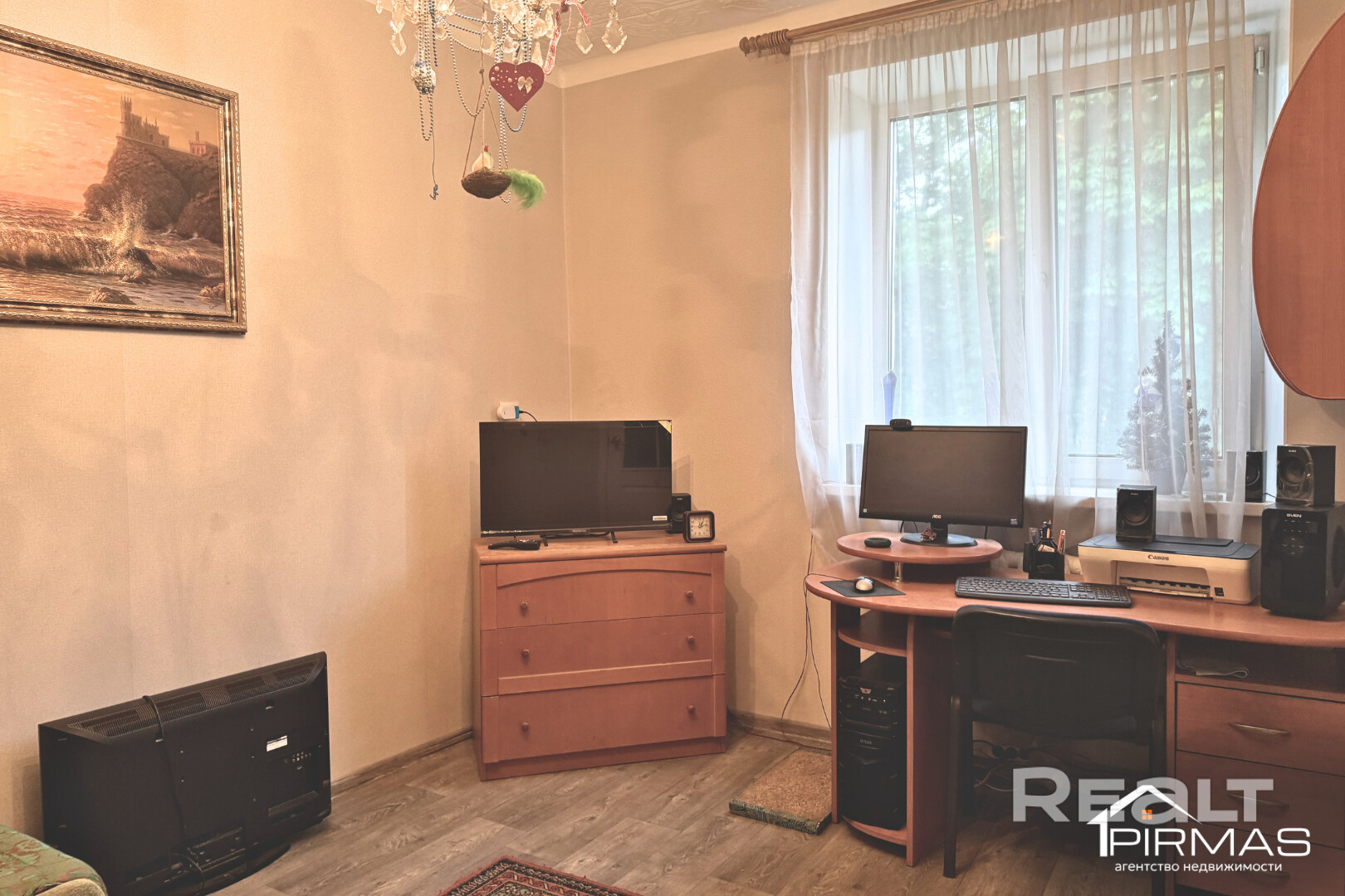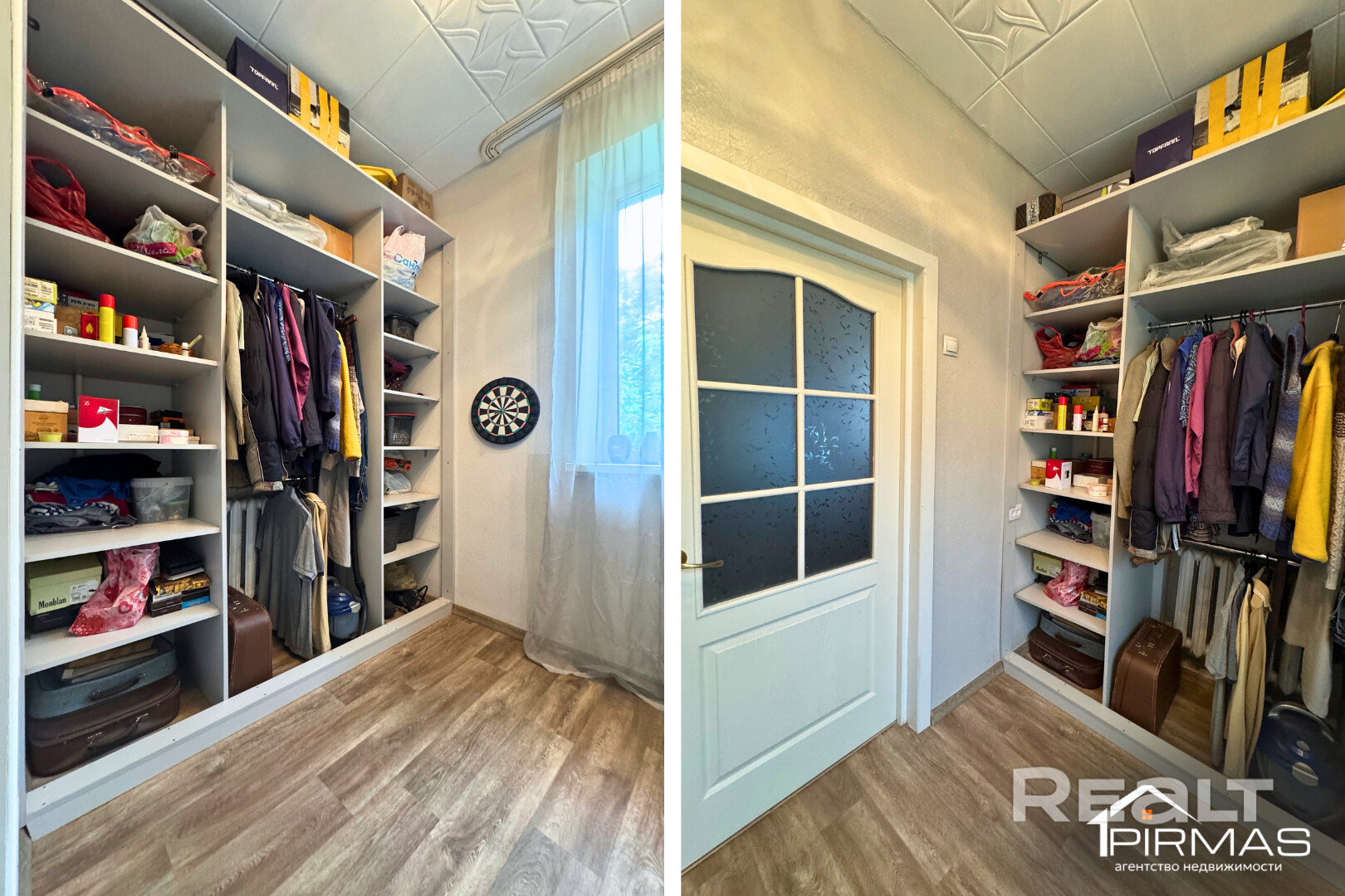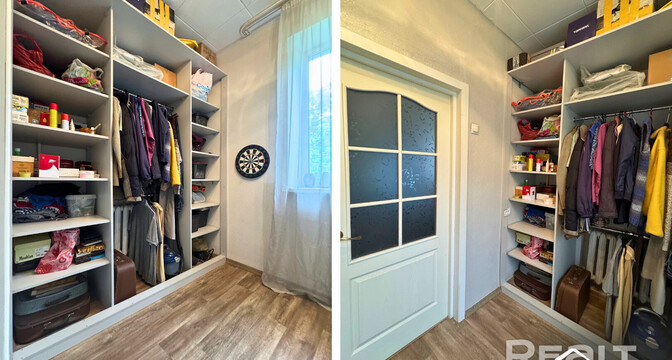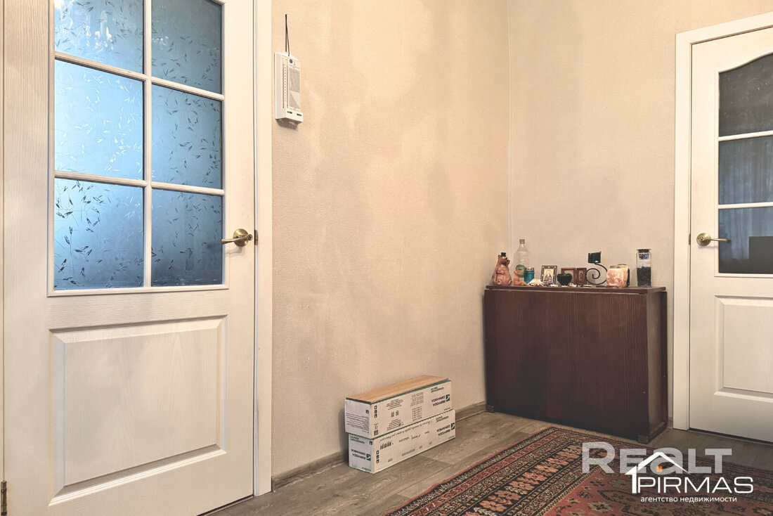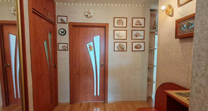 Высота потолков в квартире достигает 2,8 м. Одна из комнат — проходная. На полу здесь лежит новый линолеум, установлены стеклопакеты ПВХ и газовая колонка. В одной из комнат предусмотрено место под шкаф-купе.