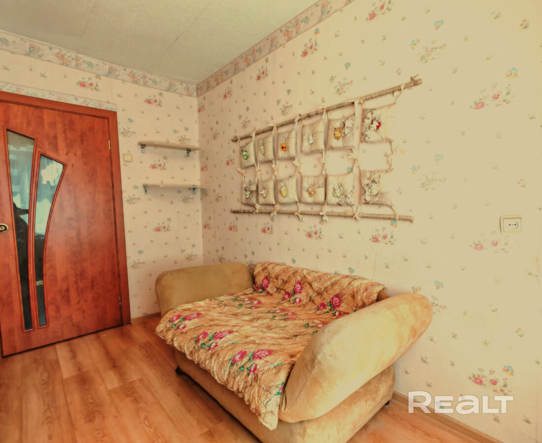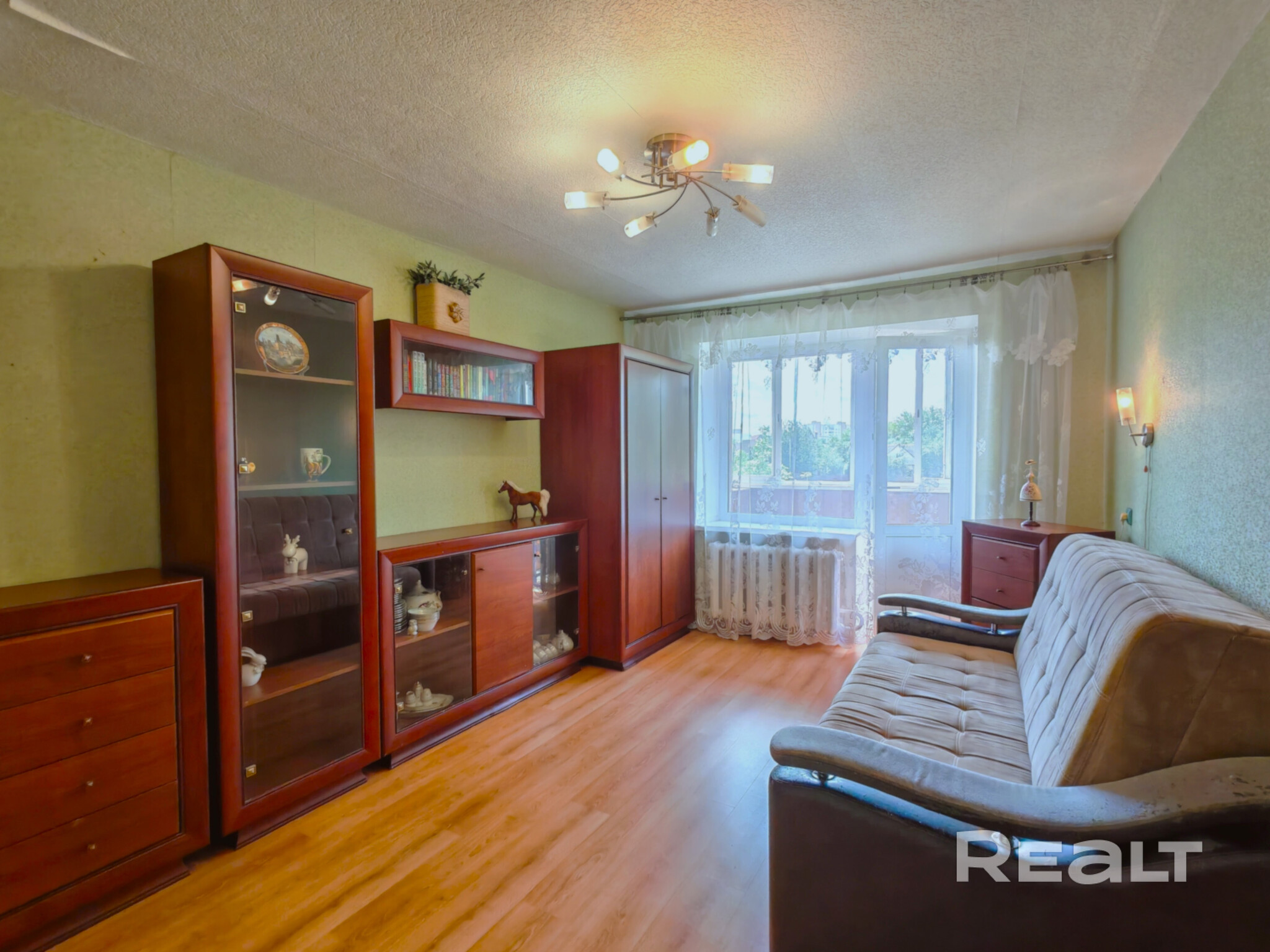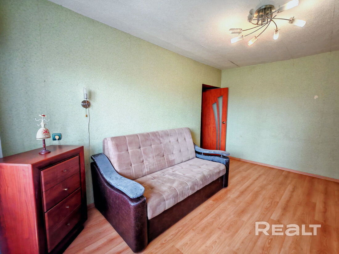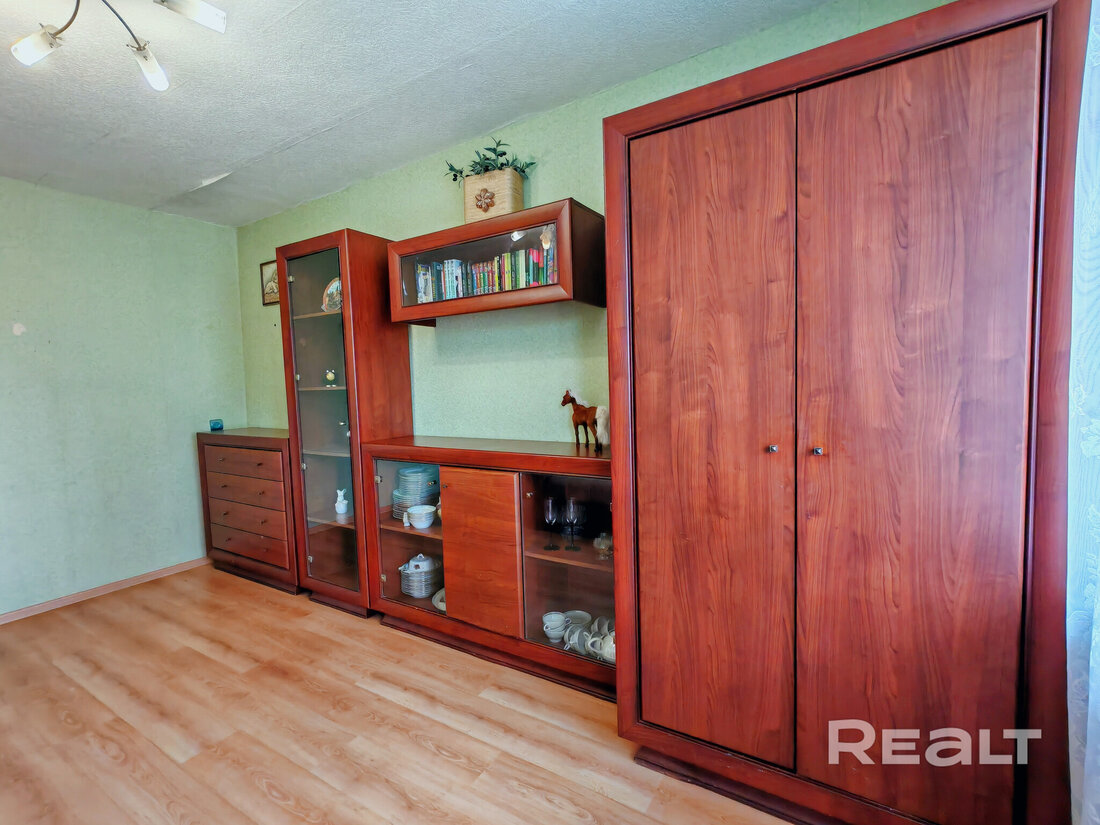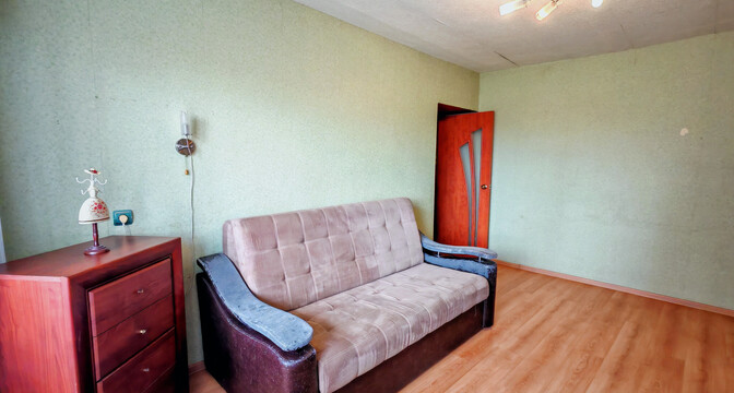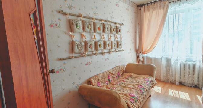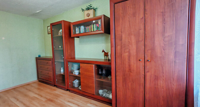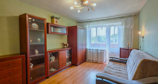 В квартире одна проходная комната. В гостиной есть выход на застекленный балкон, а в спальне — кладовая. Пол тут деревянный.
