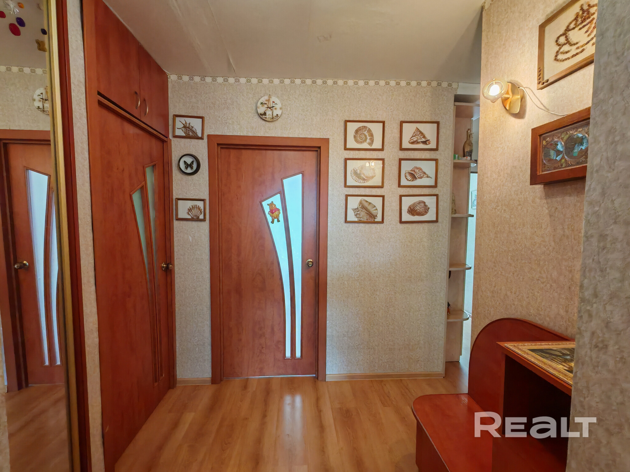 Комнаты изолированные. Гостиная идет с остекленным балконом. Все окна заменены на ПВХ. На полу — ламинат, в кухне — линолеум. В коридоре установлен шкаф-купе. Кухня оборудована холодильником, новой плитой. Потолок — подвесной со встроенными светильниками.