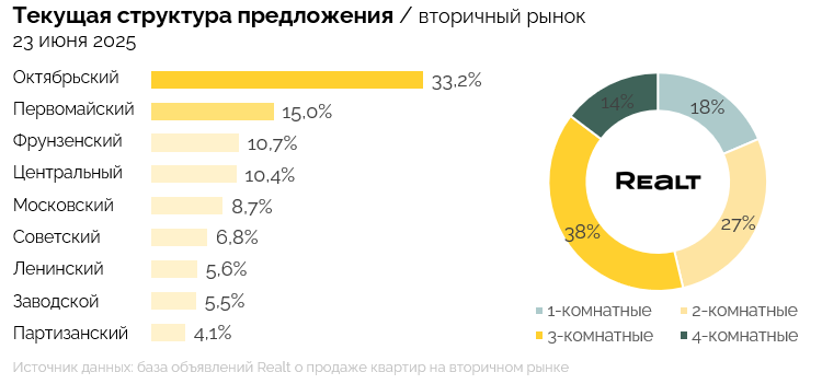 При просмотре динамики предложения по районам, можно заметить, что изменение числа объявлений произошло везде. Существеннее всего предложение увеличилось в Первомайском районе — минус 12.7%, а также в Ленинском районе — плюс 4.7%.