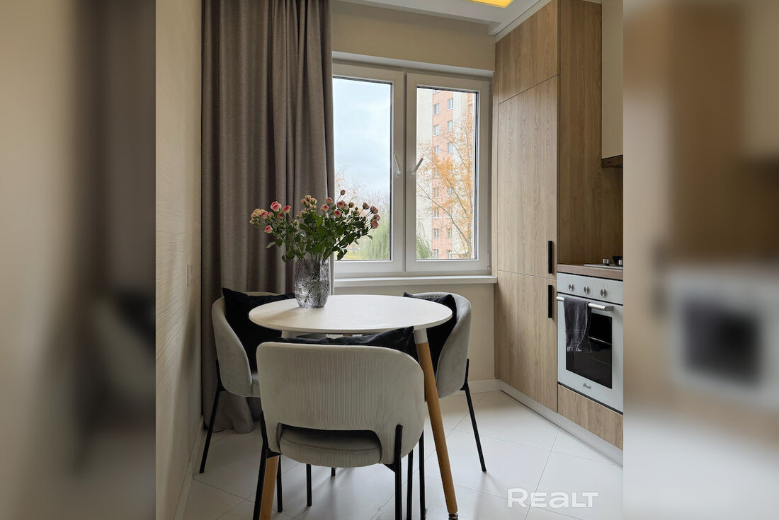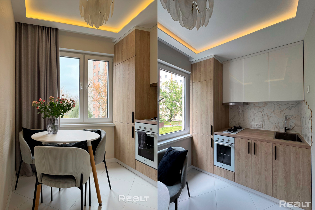 Ремонт, говорит продавец, делали для себя. Он получился аккуратным и минималистичным. В кухне из техники есть духовой шкаф, газовая варочная панель на две конфорки и вытяжка. Обеденная группа — это круглый стол и стулья.
