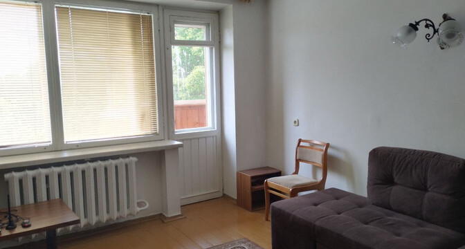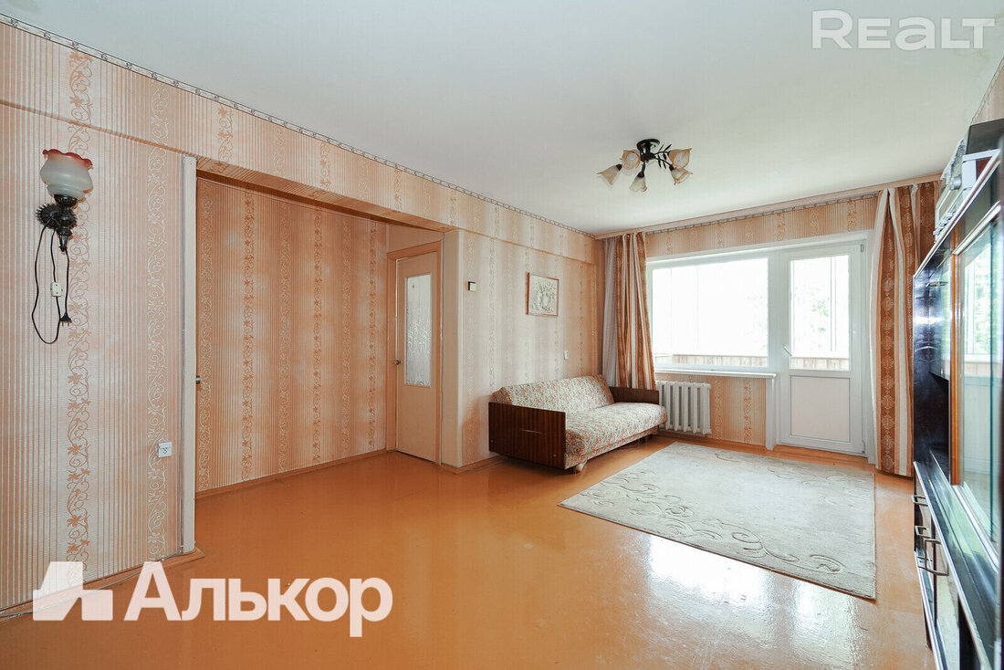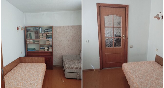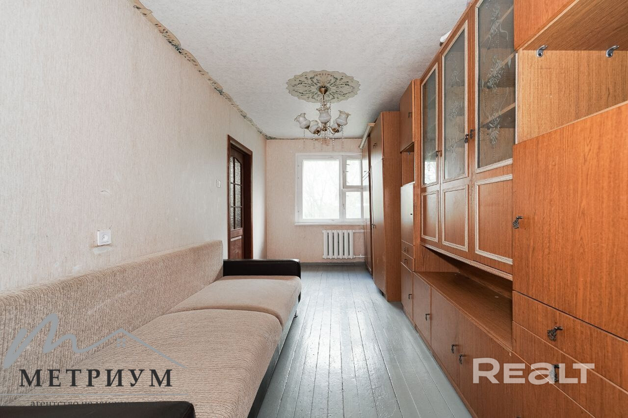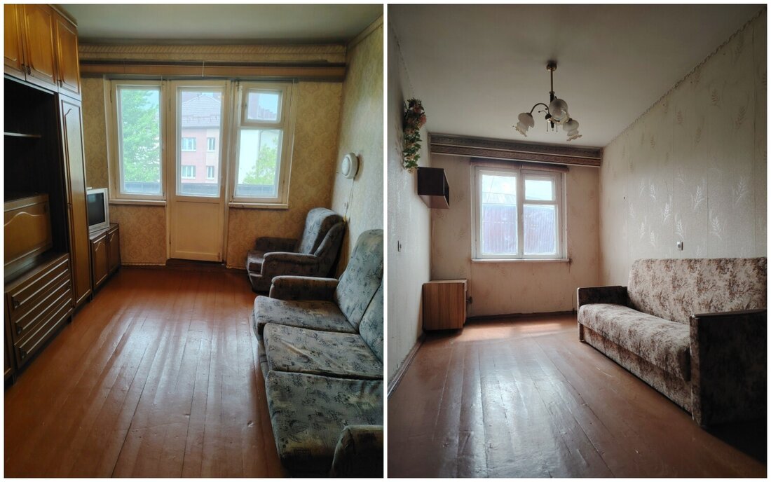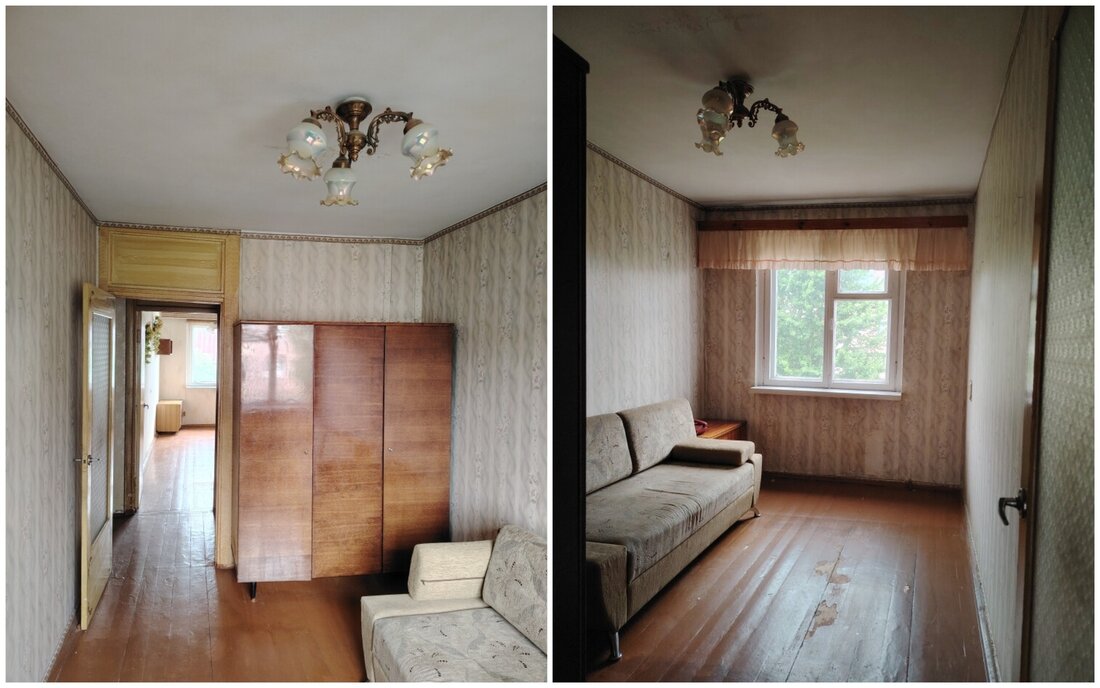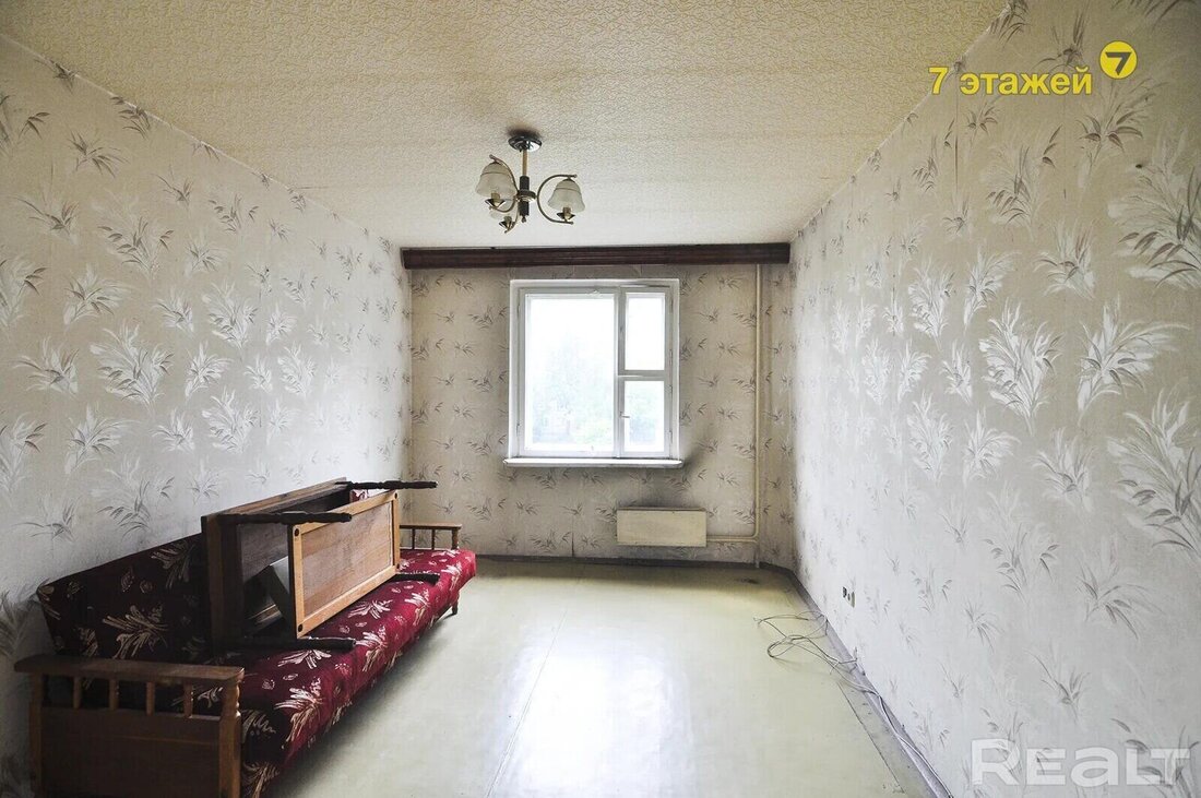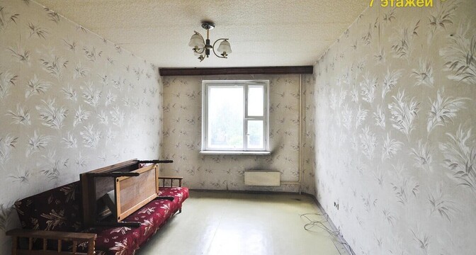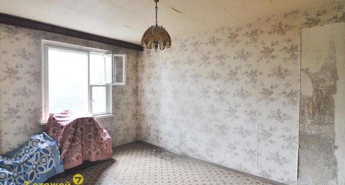 Квартира с одной проходной комнатой. В ней же есть выход на балкон. Комнаты нуждаются в ремонте. Полы здесь деревянные, в коридоре есть ниши для хранения вещей. Также покупателям достанется подвал.