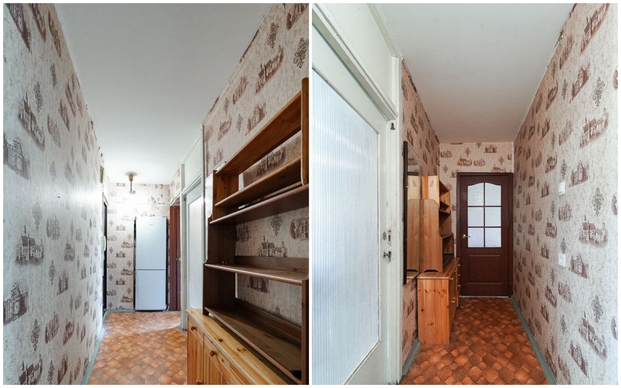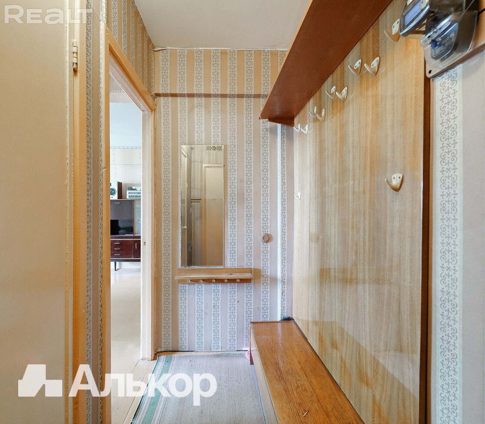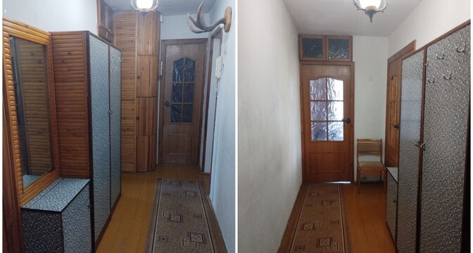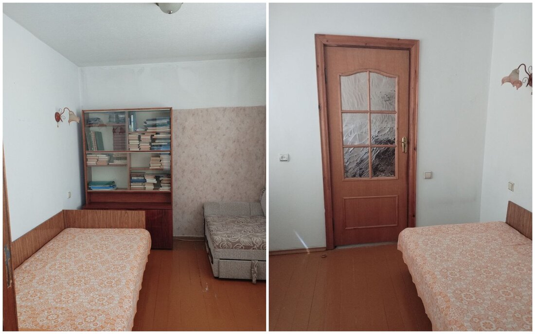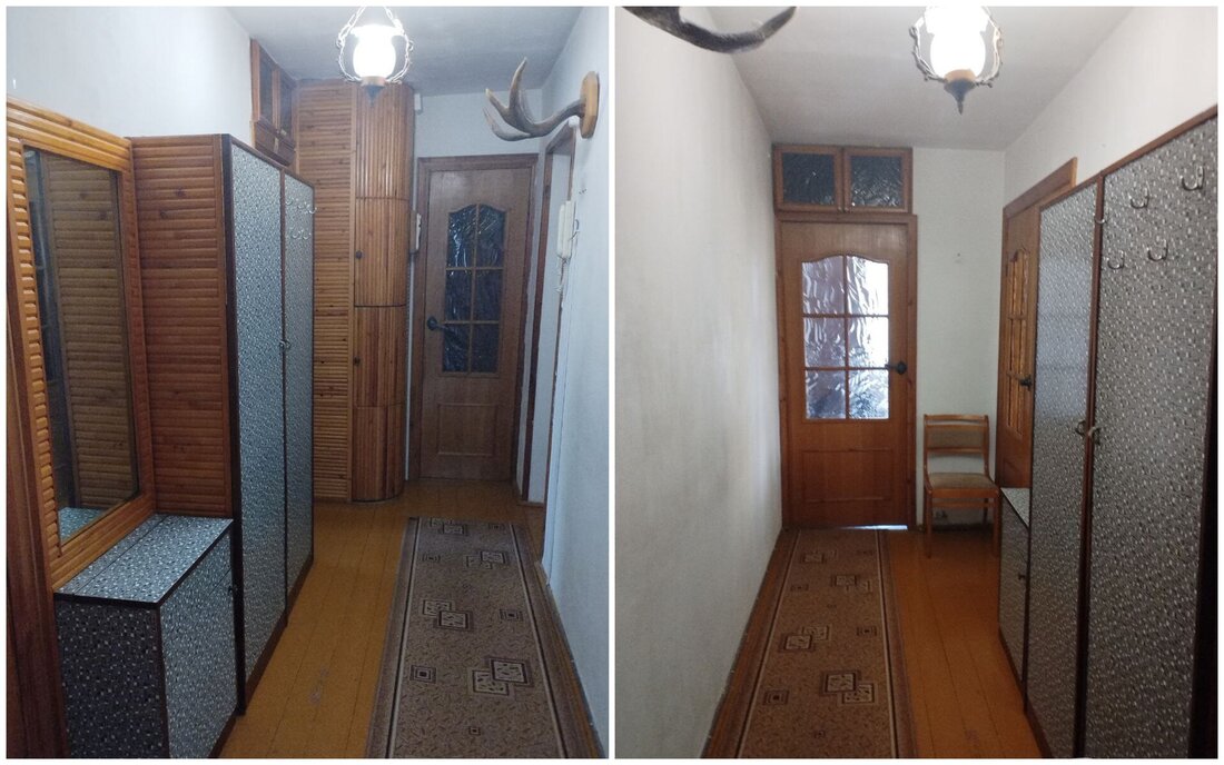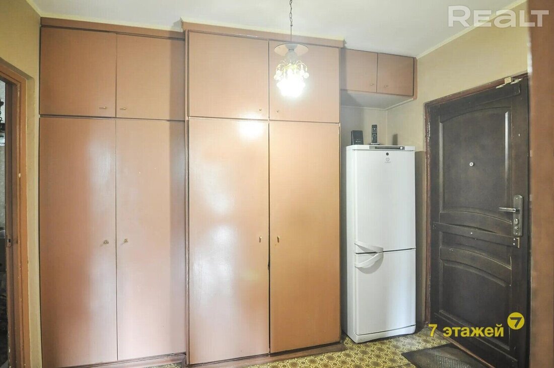 Квартира с одной проходной комнатой. В ней же есть выход на балкон. Комнаты нуждаются в ремонте. Полы здесь деревянные, в коридоре есть ниши для хранения вещей. Также покупателям достанется подвал.
