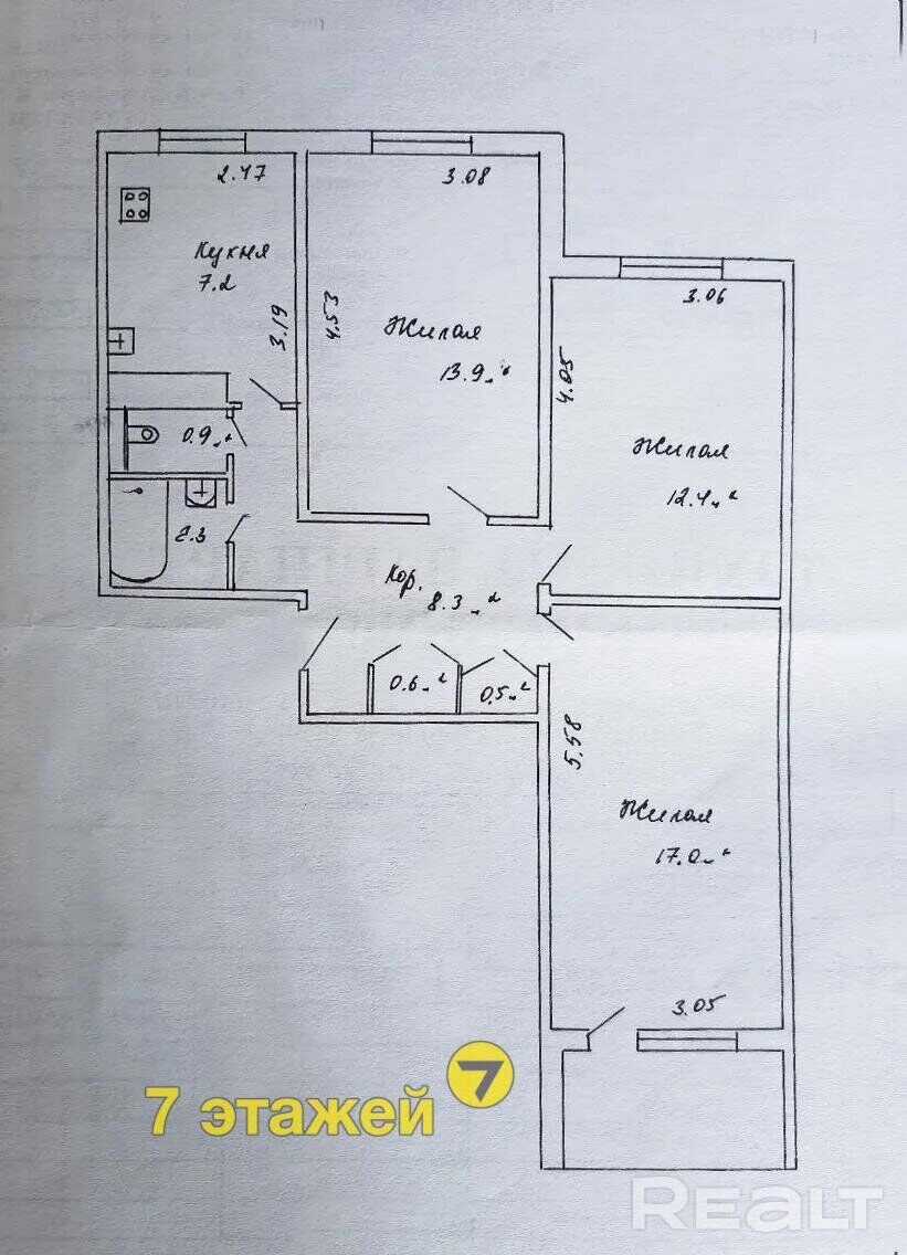 Бюджетную трешку можно купить в девятиэтажке на Ротмистрова, 30. Дом возвели в 1986 году. Площадь квартиры — 63,1 м². Из них 7,2 м² — это кухня.