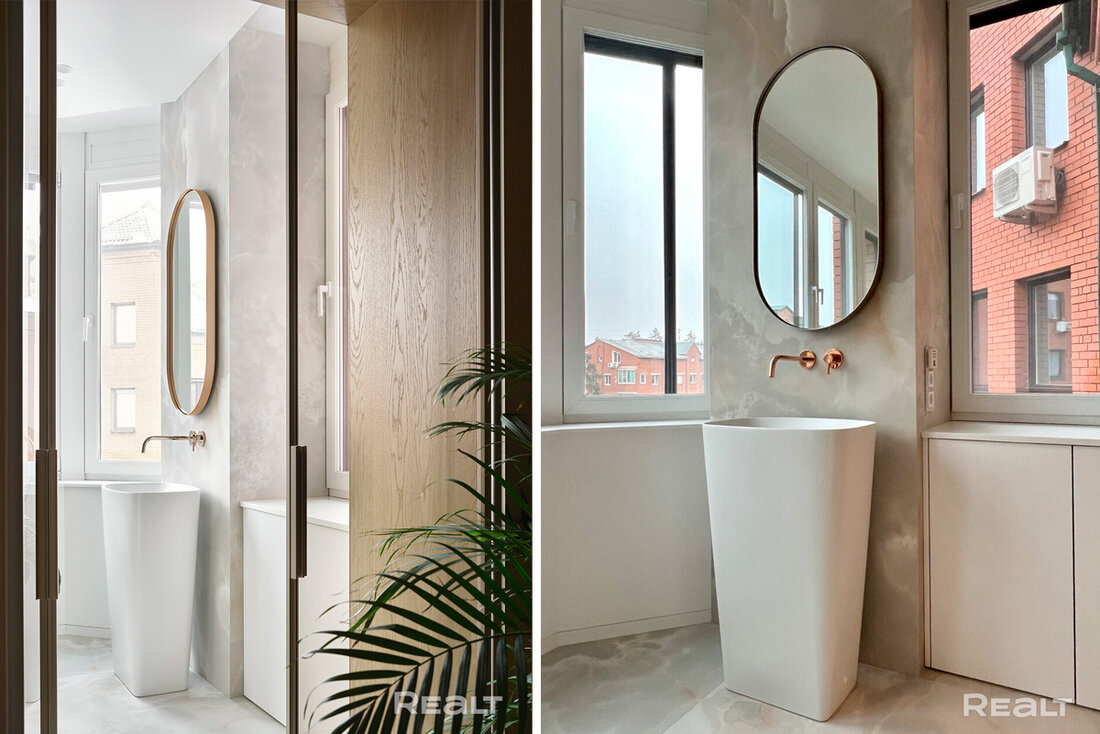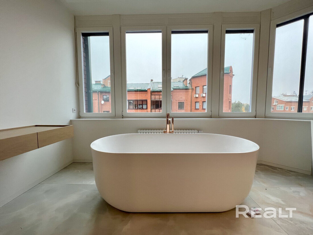 Ванная заслуживает отдельного внимания. В комнате большое окно, отдельностоящая ванна и умывальник.