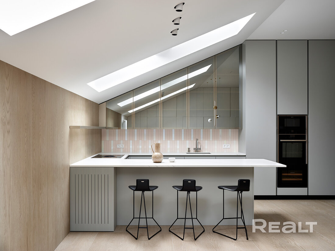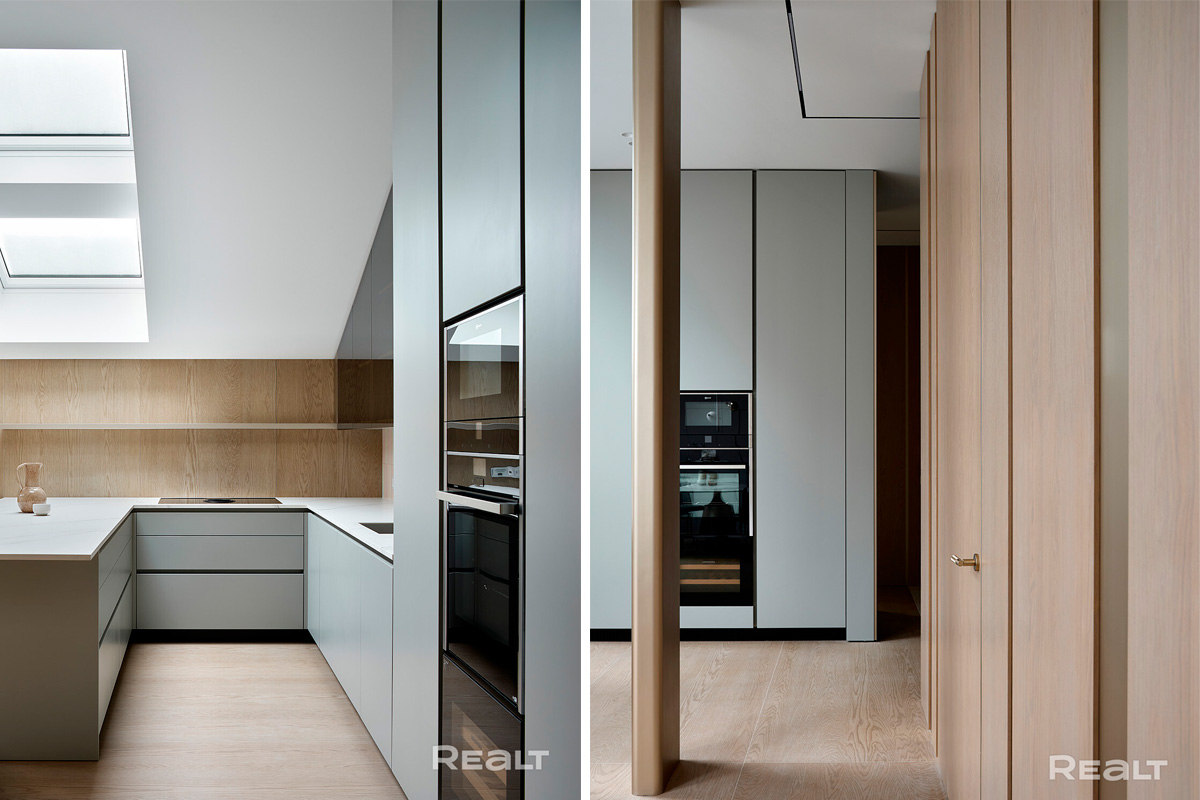 На втором уровне размещается кухня. Здесь встроенное немецкое оборудование NEFF, встроенный холодильник и морозильник LIEBHERR, посудомоечная машина. Плитка и керамическая столешница из Италии.