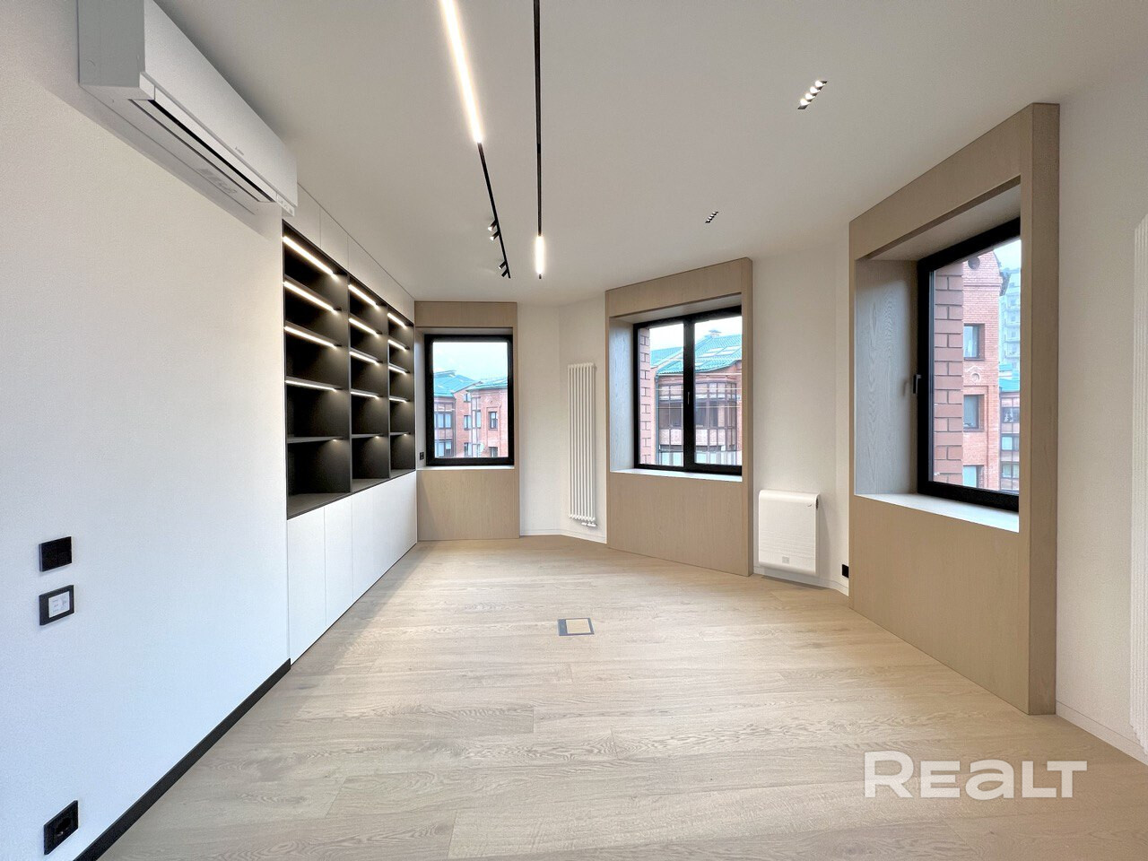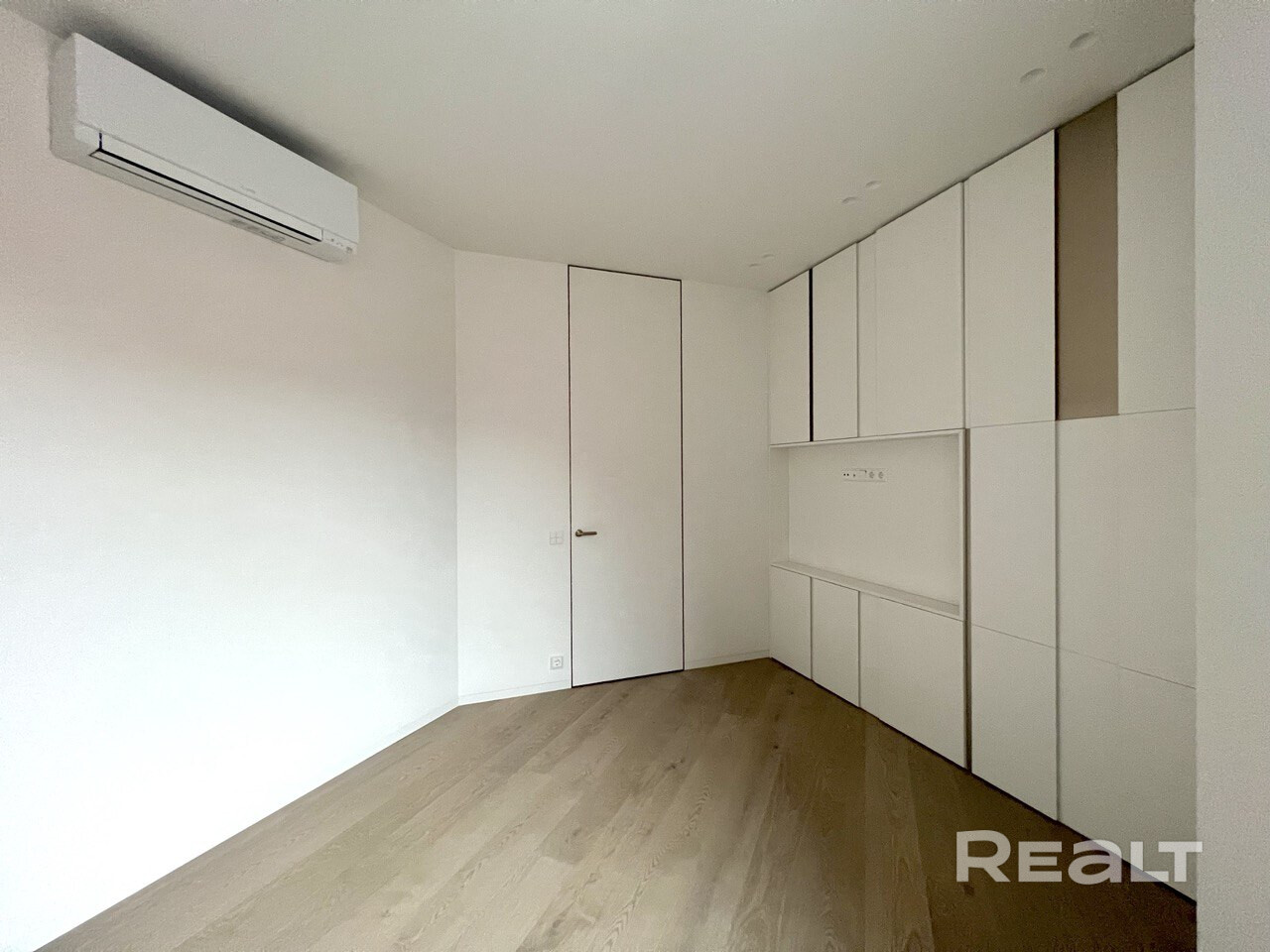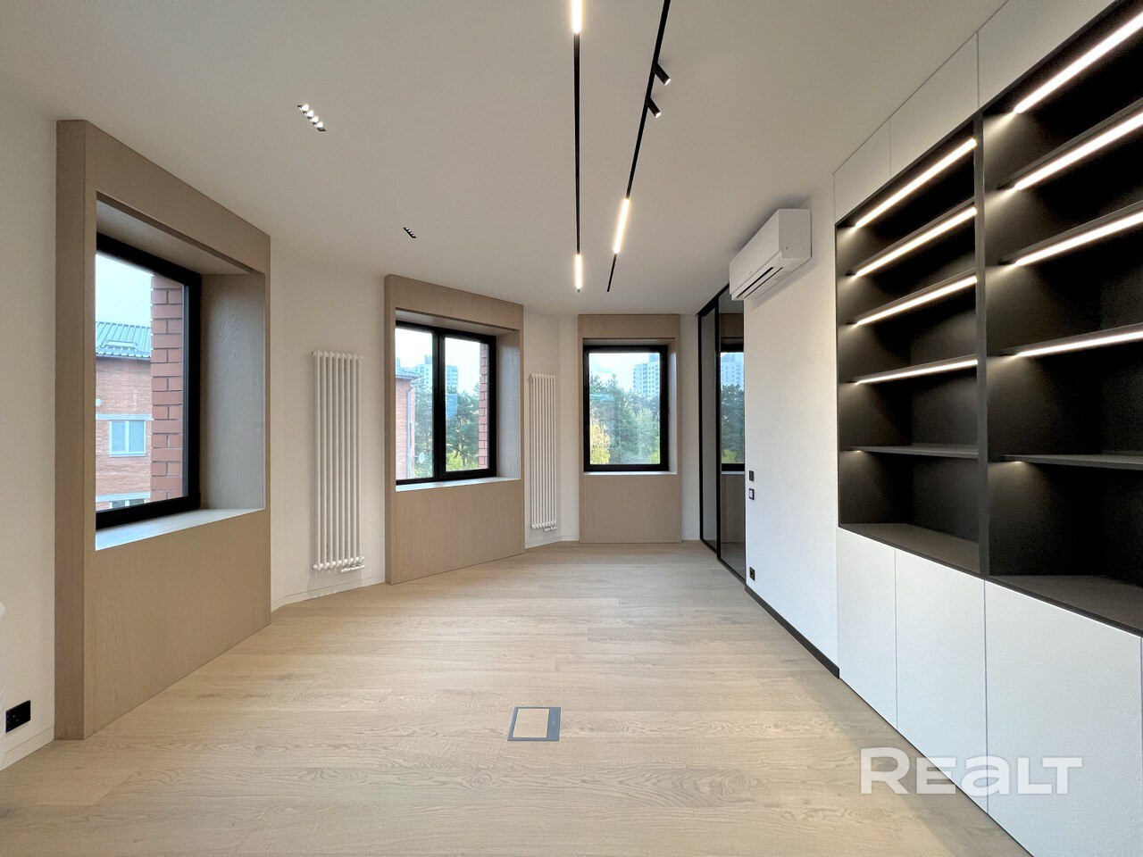 На этом же этаже есть гостиная. На полу в комнате лежит паркетная доска. Установлен кондиционер. Мебель изготовлена по индивидуальному проекту.